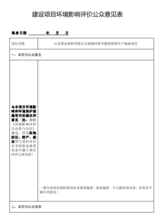 江苏伟业铝材有限公司高端环保节能铝型材生产基地项目 环评第一次公示