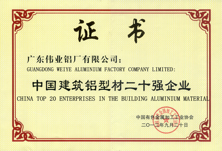 “China Top 20 in Architecture Aluminium profiles” in 2012