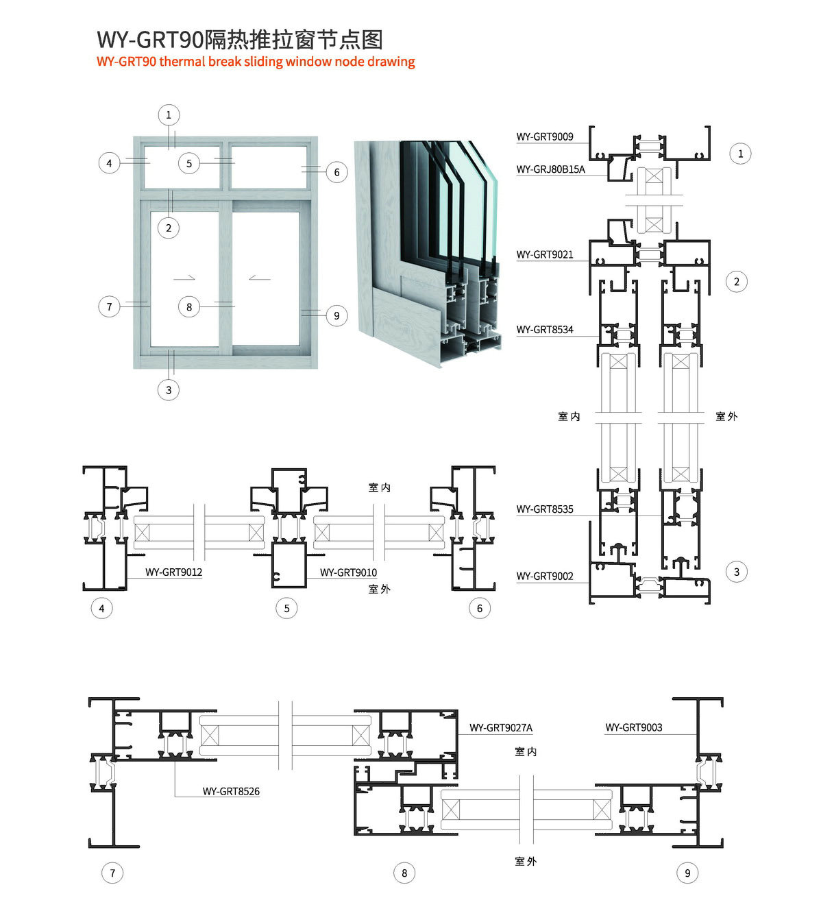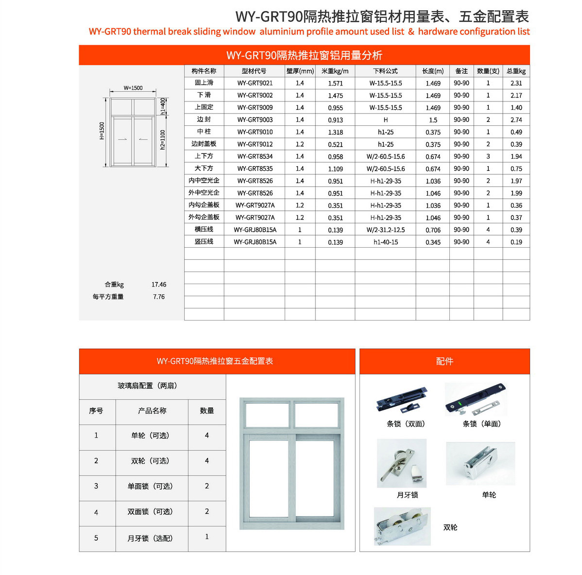 主型材:边封宽90mm,型材壁厚1.4mm;采用20mm隔热条,强度高,降低传导系数,保温隔热性能优越,抗拉、抗剪强度高。 连接方式:采用螺钉90度插接,加工工艺方便、简单、可靠 玻璃槽口:28mm 开启方式:水平推拉 可做窗型:两扇窗、四扇窗、转角飘窗、门联窗等 适用范围:民用建筑和工程 耗材:1.5mx1.5m标准窗型每平方耗材7.7kg