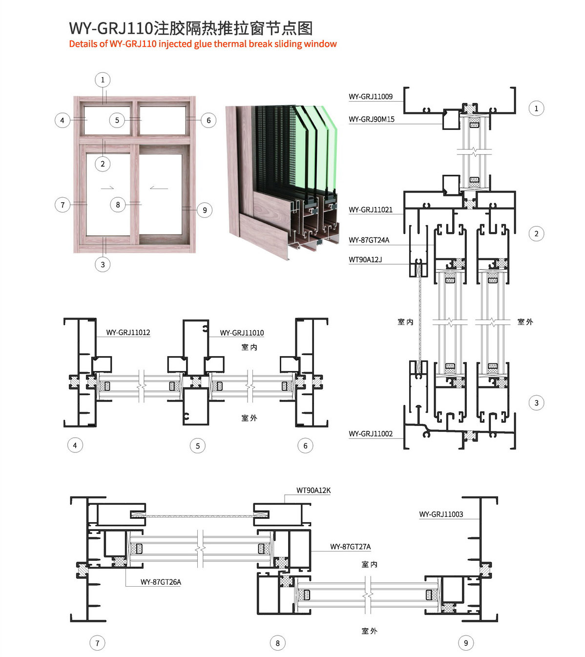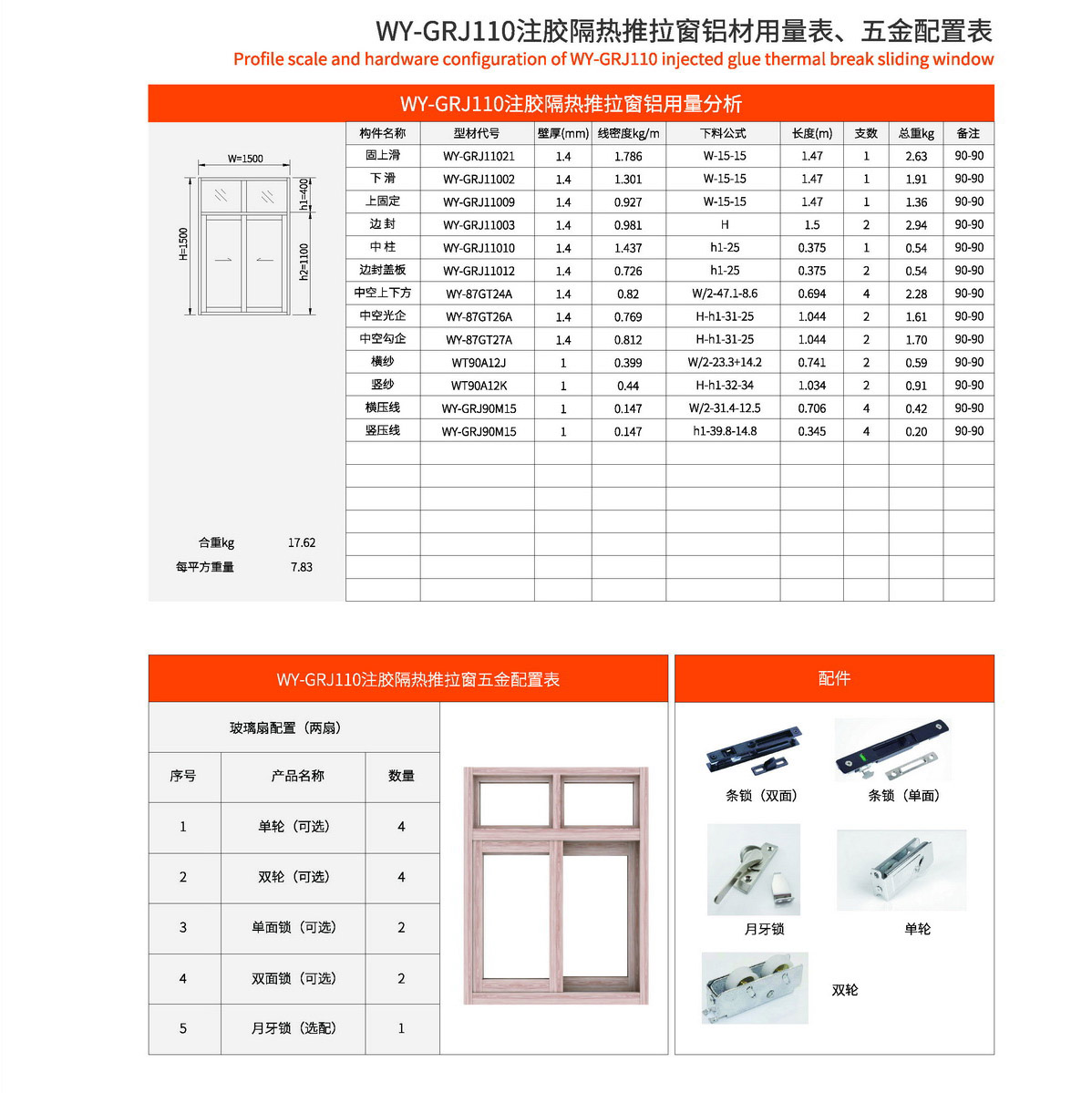 主型材:边封宽110mm,型材壁厚1.4mm;采用美式注胶断桥铝型材,强度高,降低传导系数,保温隔热性能优越,抗拉、抗剪强度高。 连接方式:采用螺钉90度插接,加工工艺方便、简单、可靠 玻璃槽口:24mm 开启方式:水平推拉 可做窗型:两扇窗等 适用范围:民用建筑和工程 耗材:1.5mx1.5m标准窗型每平方耗材7.8kg
