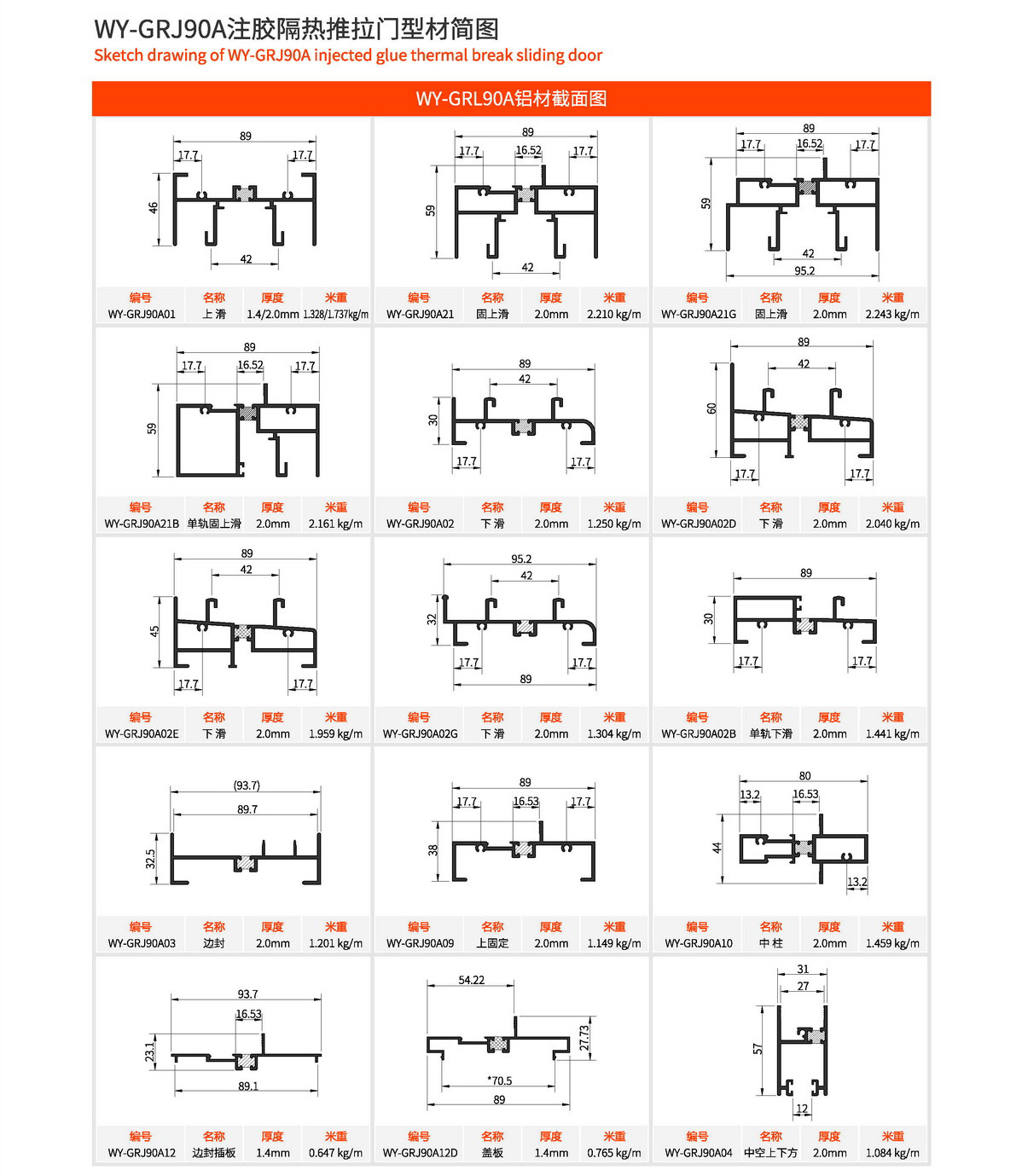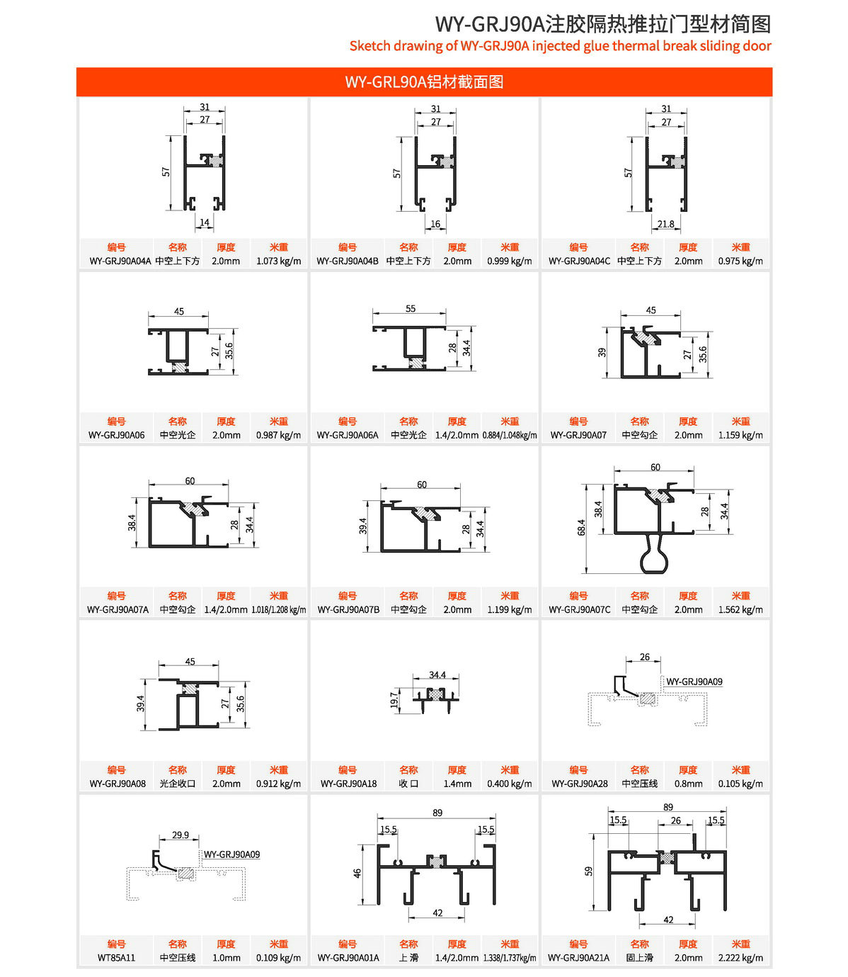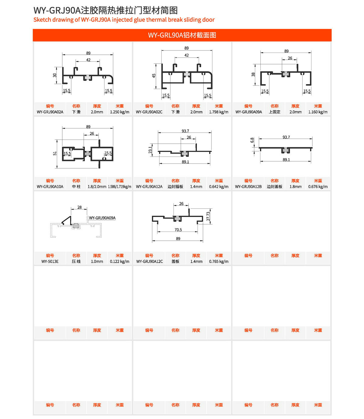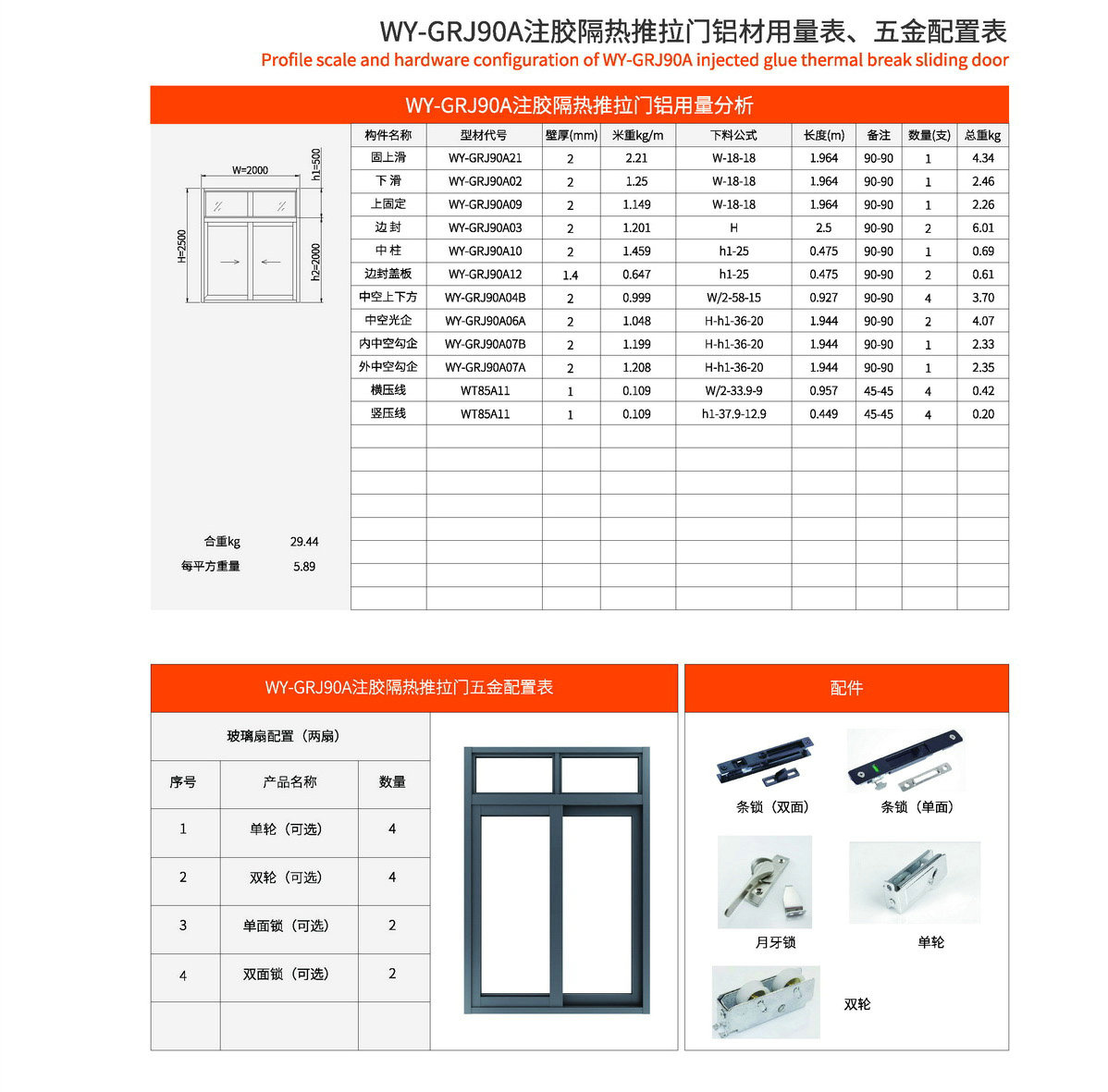 主型材:边封宽94mm,型材壁厚2.0mm;采用美式注胶断桥铝型材,强度高,降低传导系数,保温隔热性能优越,抗拉、抗剪强度高。 连接方式:采用螺钉90度插接,加工工艺方便、简单、可靠 玻璃槽口:27mm、28mm 开启方式:水平推拉 可做窗型:两扇门、四扇门等 适用范围:民用建筑和工程 耗材:2.5mx2.0m标准窗型每平方耗材5.9kg