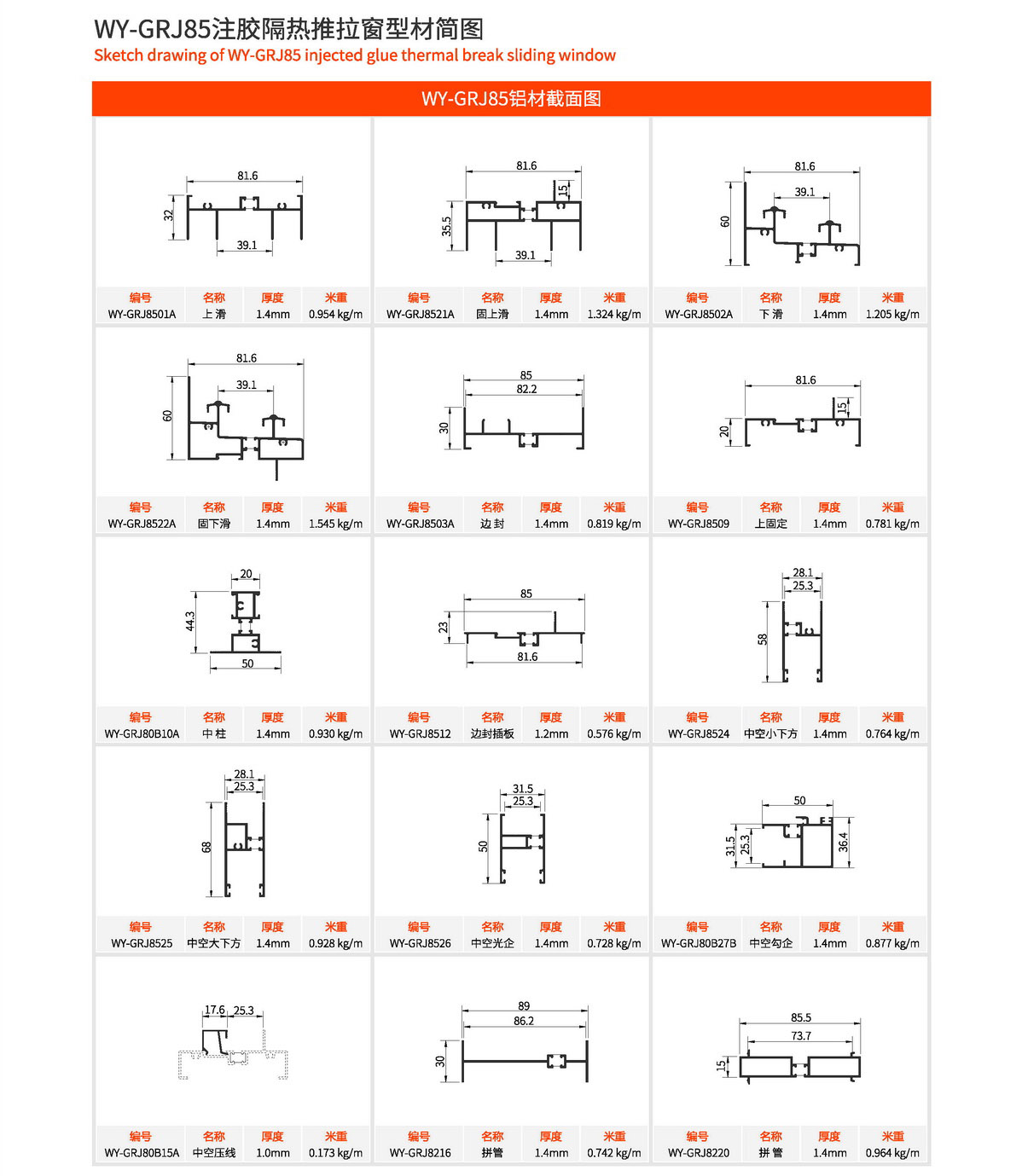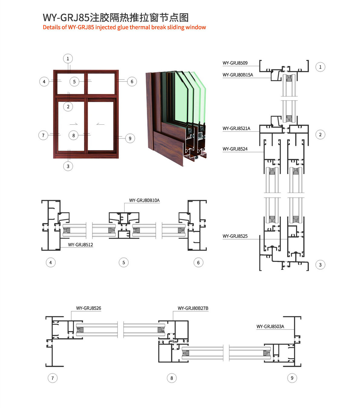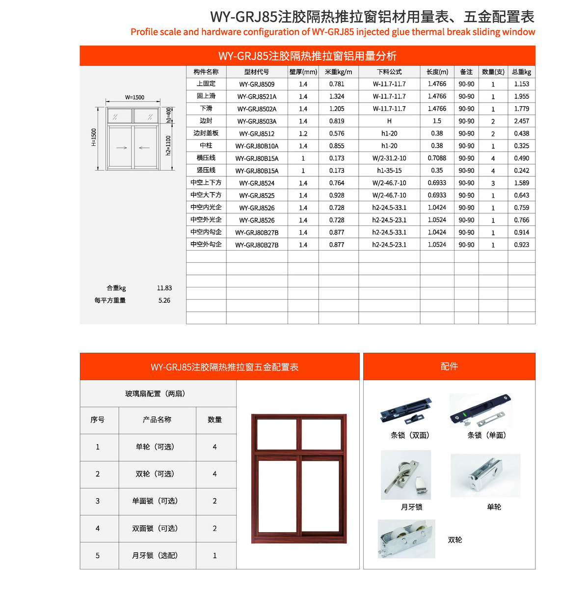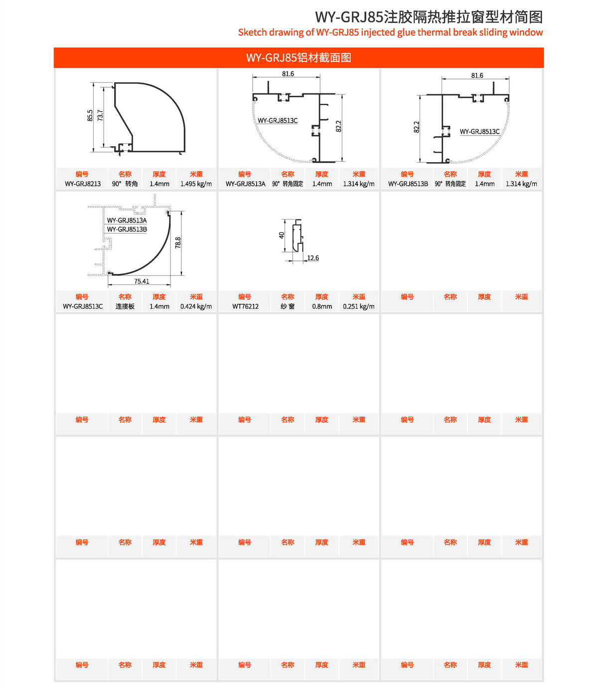 主型材:边封宽85mm,型材壁厚1.4mm;采用美式注胶断桥铝型材,强度高,降低传导系数,保温隔热性能优越,抗拉、抗剪强度高。 连接方式:采用螺钉90度插接,加工工艺方便、简单、可靠 玻璃槽口:25.3mm 开启方式:水平推拉 可做窗型:两扇窗、四扇窗、转角飘窗、门联窗等 适用范围:民用建筑和工程 耗材:1.5mx1.5m标准窗型每平方耗材5.26kg