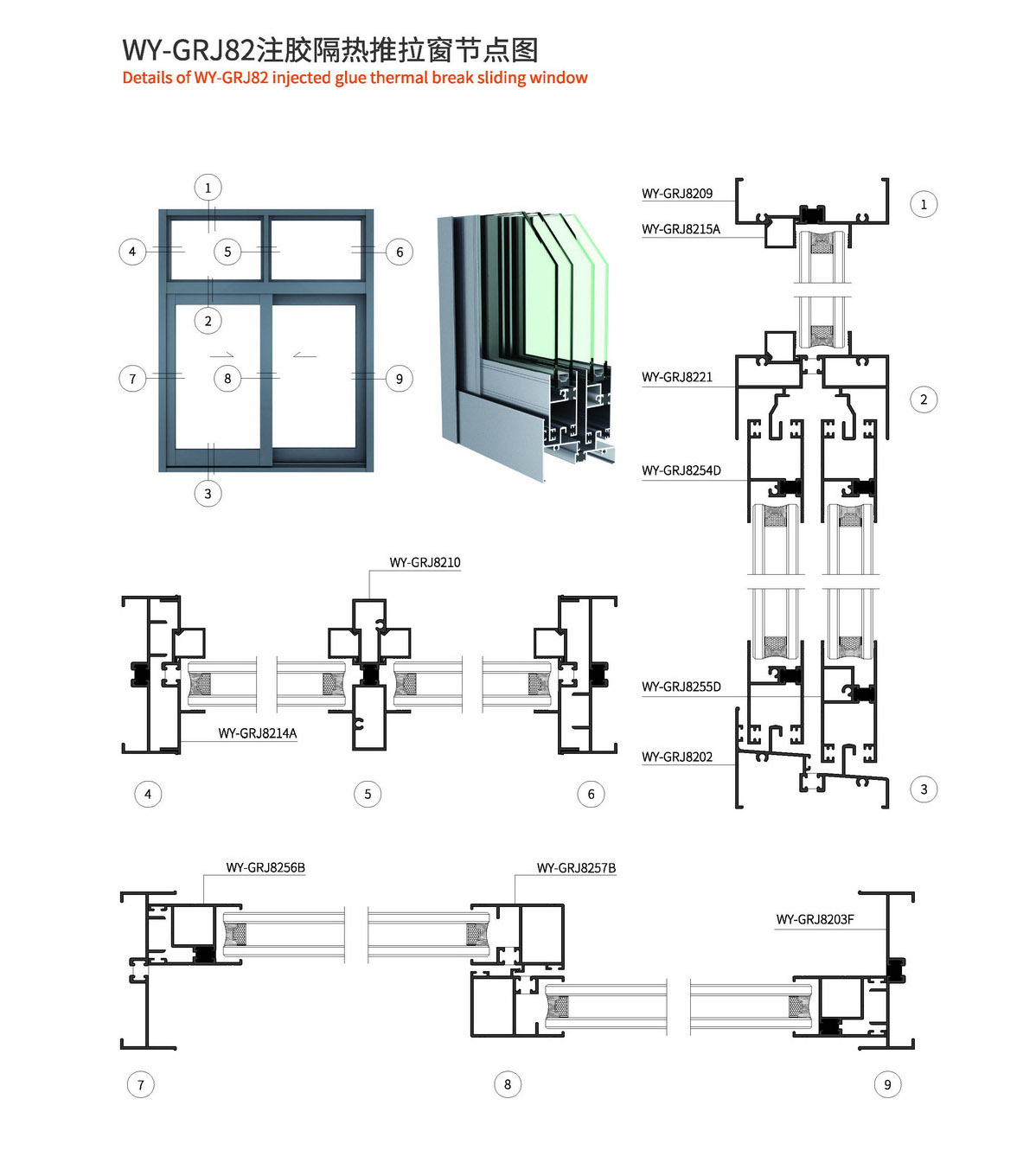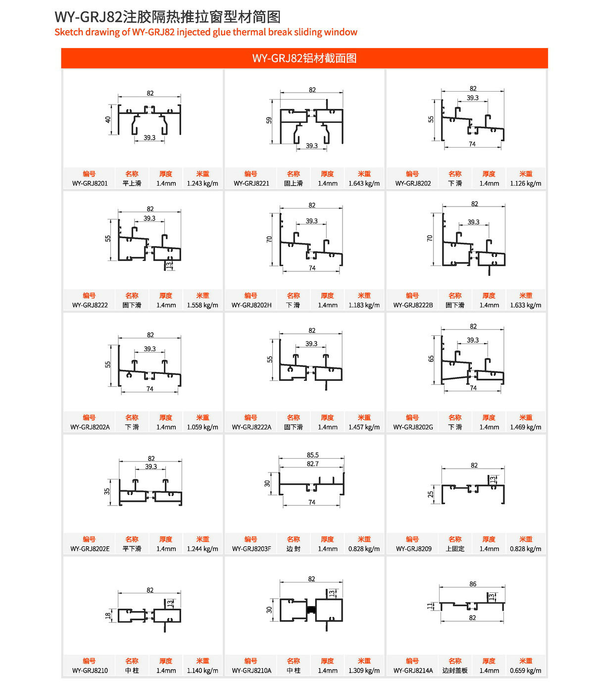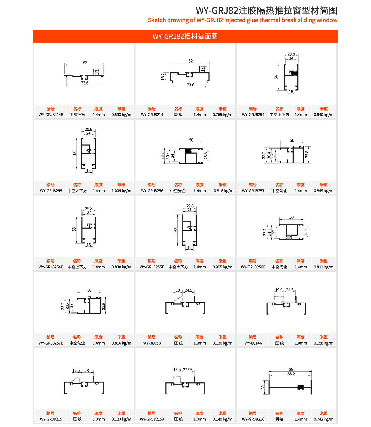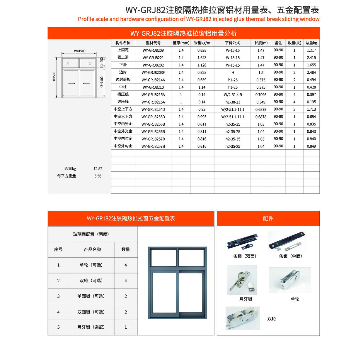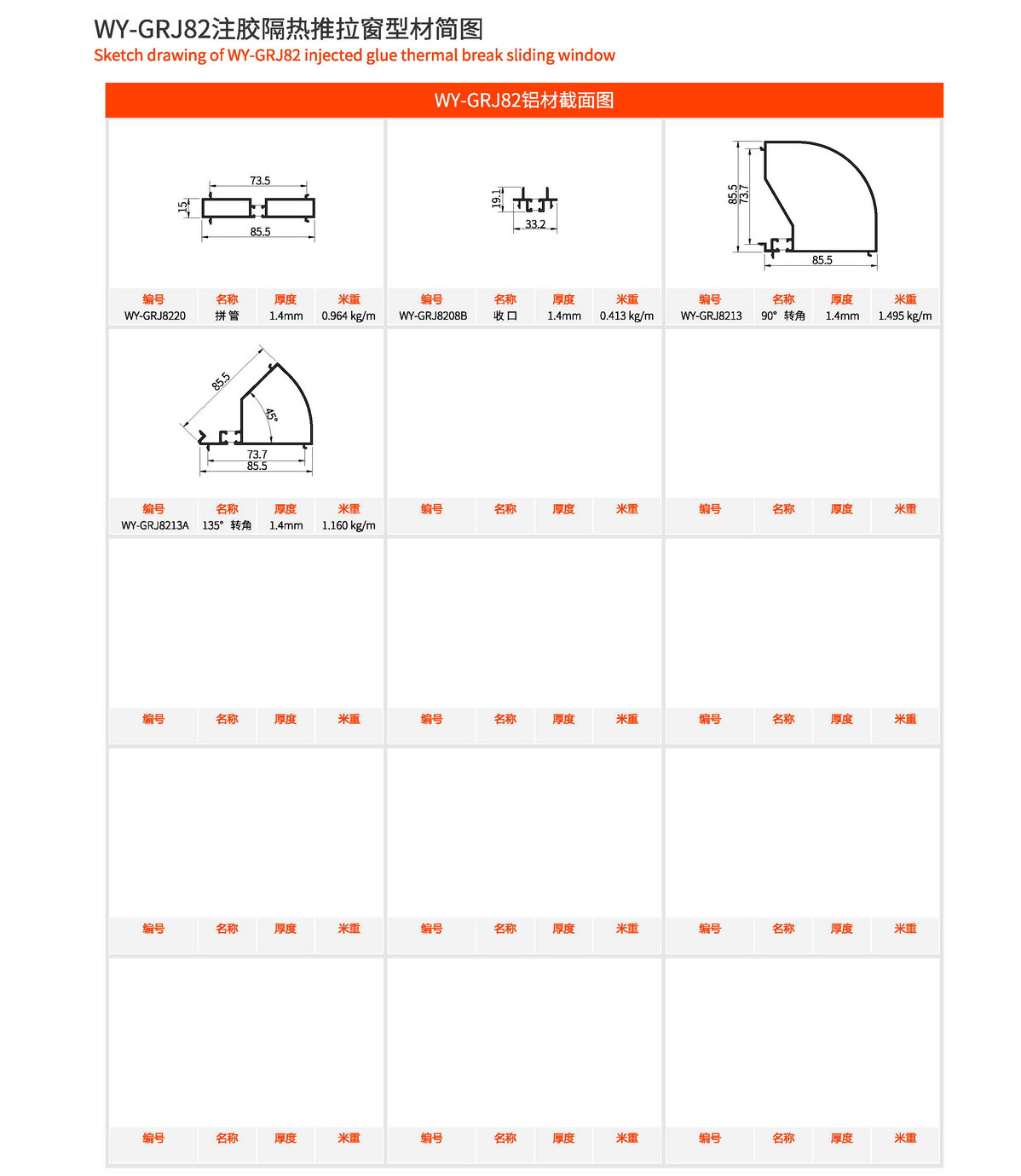 主型材:边封宽85mm,型材壁厚1.4mm;采用美式注胶断桥铝型材,强度高,降低传导系数,保温隔热性能优越,抗拉、抗剪强度高。 连接方式:采用螺钉90度插接,加工工艺方便、简单、可靠 玻璃槽口:24mm、27 mm 开启方式:水平推拉 可做窗型:两扇窗、四扇窗、转角飘窗、门联窗等 适用范围:民用建筑和工程 耗材:1.5mx1.5m标准窗型每平方耗材6.4kg