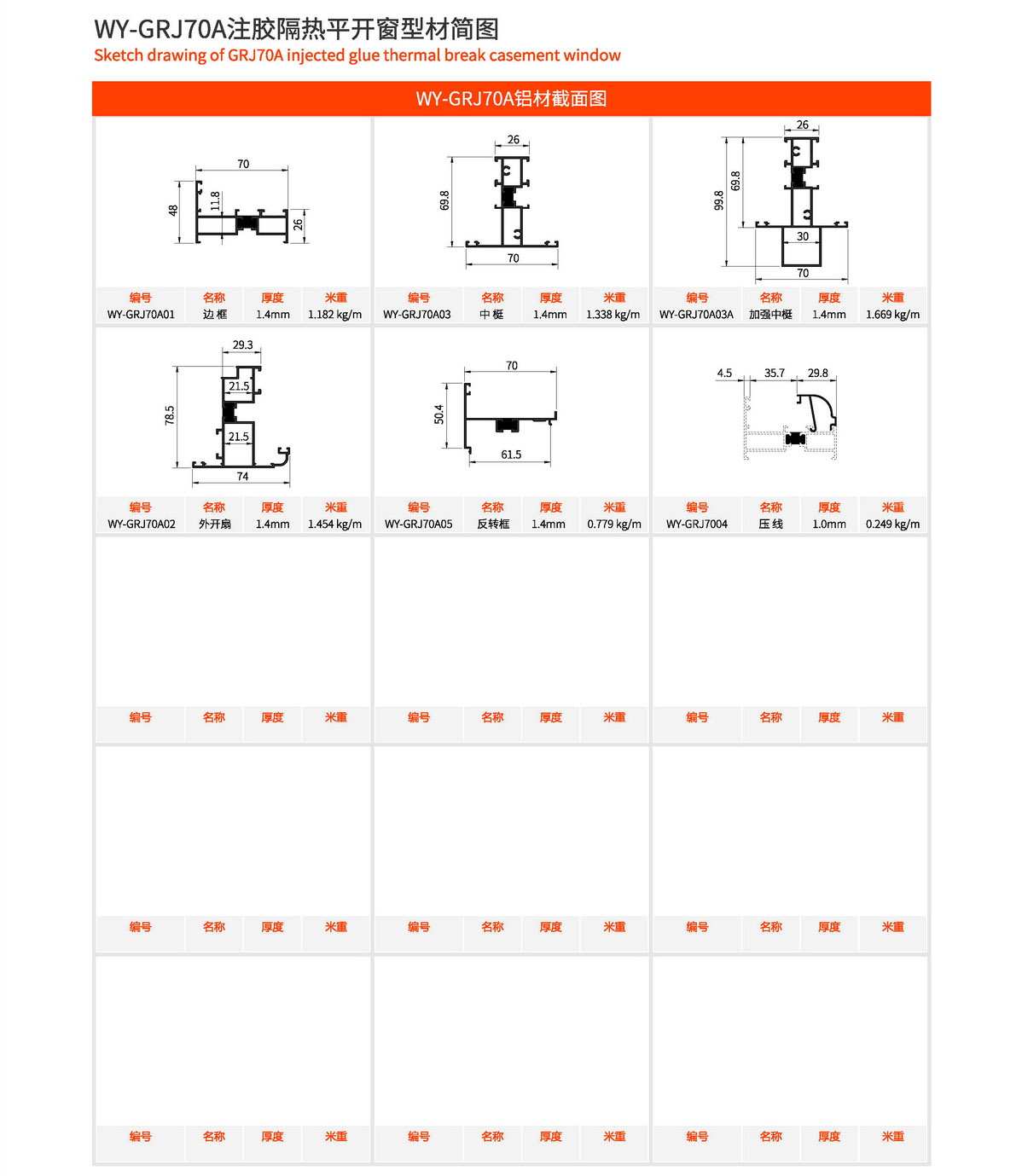 1、外框宽70mm,边框壁厚1.4mm,门扇壁厚1.4mm。 2、型材采用注胶隔热工艺,强度好。 3、五金槽口均采用欧标槽口设计,可自由搭配标准配件。 4、框扇采用45°切锯角码撞角连接,牢固可靠。 5、玻璃槽口可根据需要自由搭配压线。 6、1.5mx1.5m标准窗型每平方耗材11.4kg。