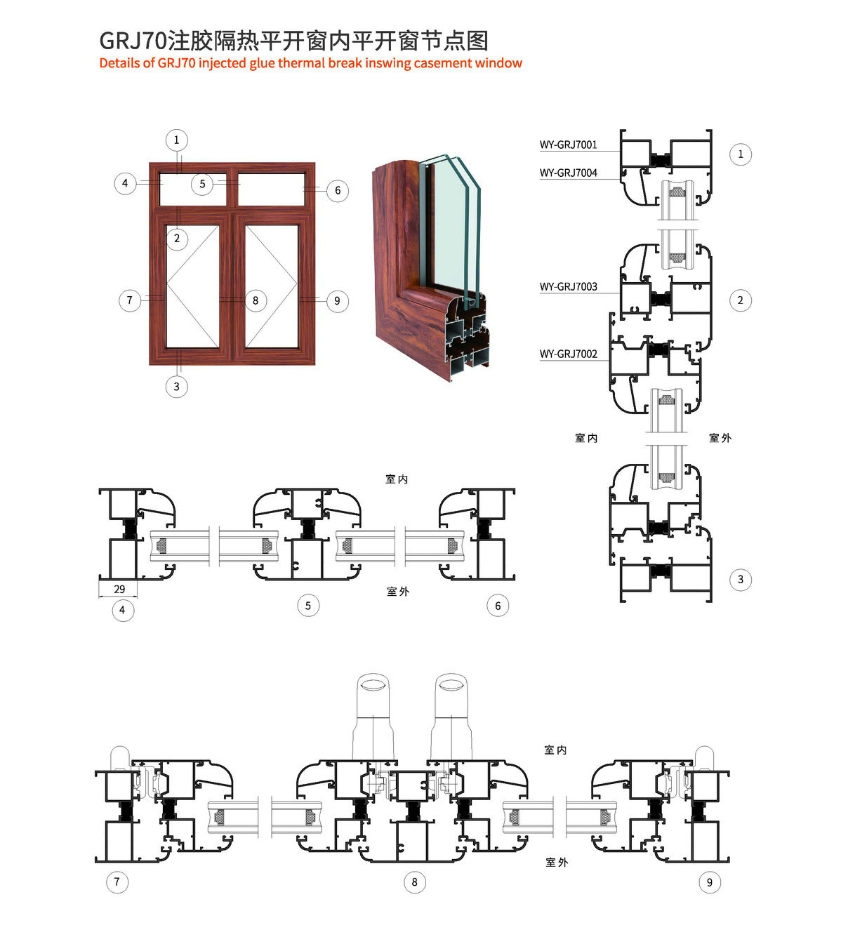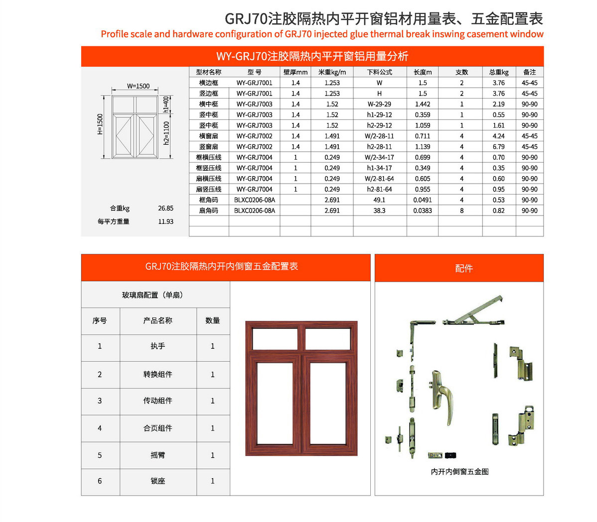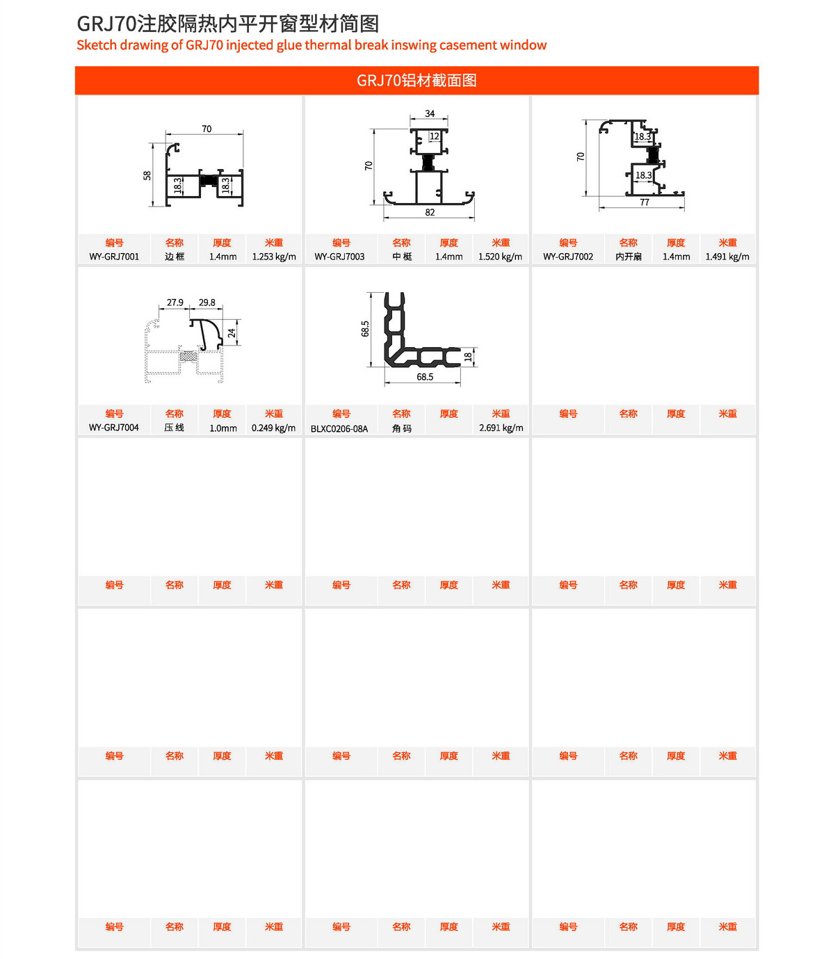 1、外框宽70mm,边框壁厚1.4mm,门扇壁厚1.4mm。 2、型材采用注胶隔热工艺,强度好。 3、五金槽口均采用欧标槽口设计,可自由搭配标准配件。 4、框扇采用45°切锯角码撞角连接,牢固可靠。 5、采用花边设计,外观更加大气美观。 6、玻璃槽口可根据需要自由搭配压线。 7、1.5mx1.5m标准窗型每平方耗材11.9kg。