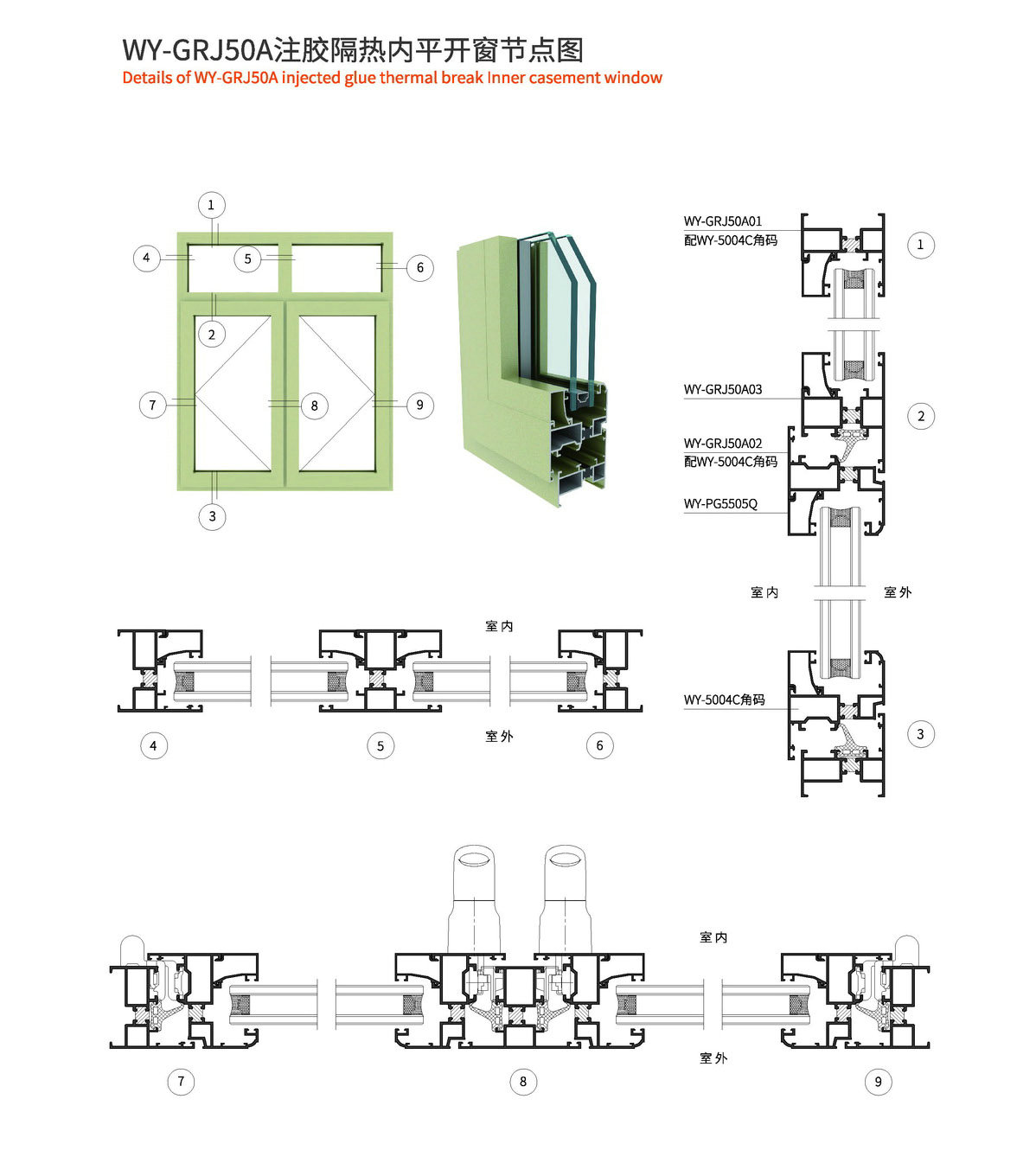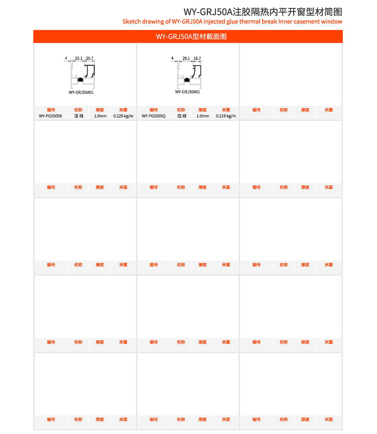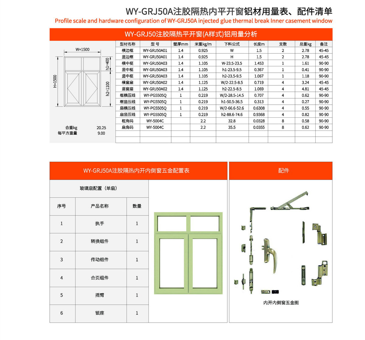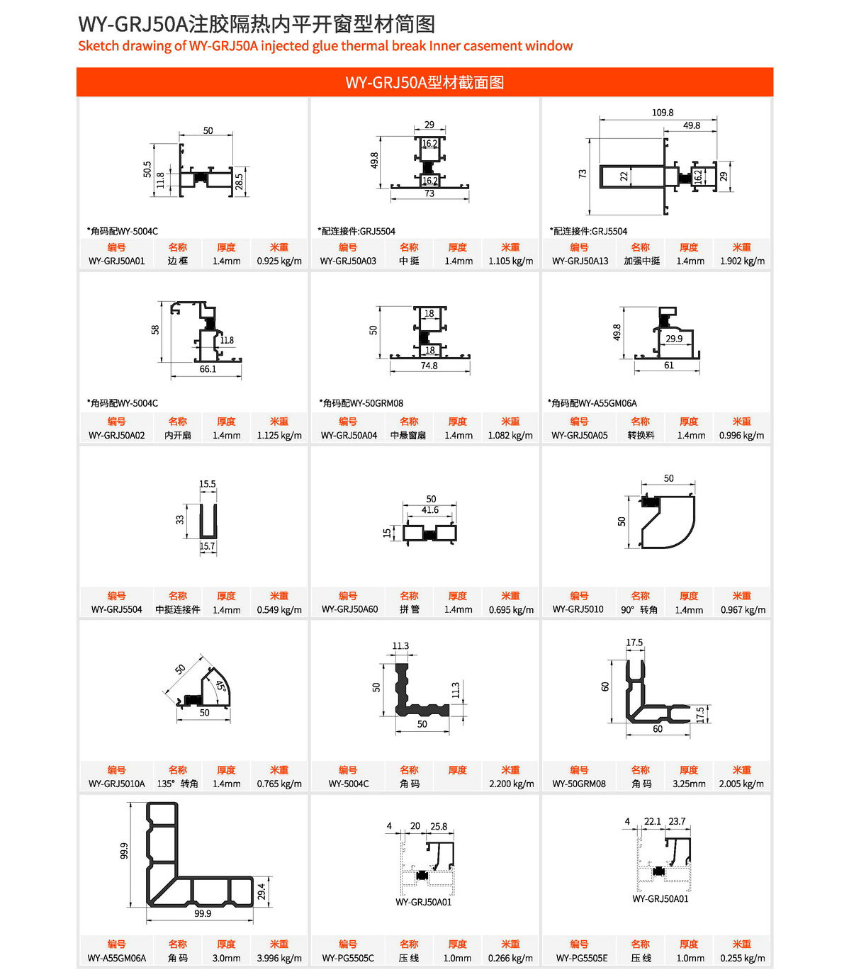 1、外框宽50mm,边框壁厚1.4mm,门扇壁厚1.4mm。 2、型材采用注胶隔热工艺,强度好。 3、五金槽口均采用欧标槽口设计,可自由搭配标准配件。 4、框扇采用45°切锯角码撞角连接,牢固可靠。 5、可做内开、外开等多种窗型。 6、玻璃槽口可根据需要自由搭配压线。 7、1.5mx1.5m标准窗型每平方耗材9.0kg。