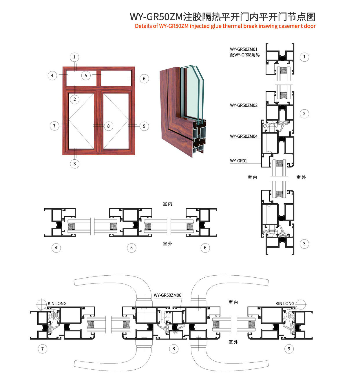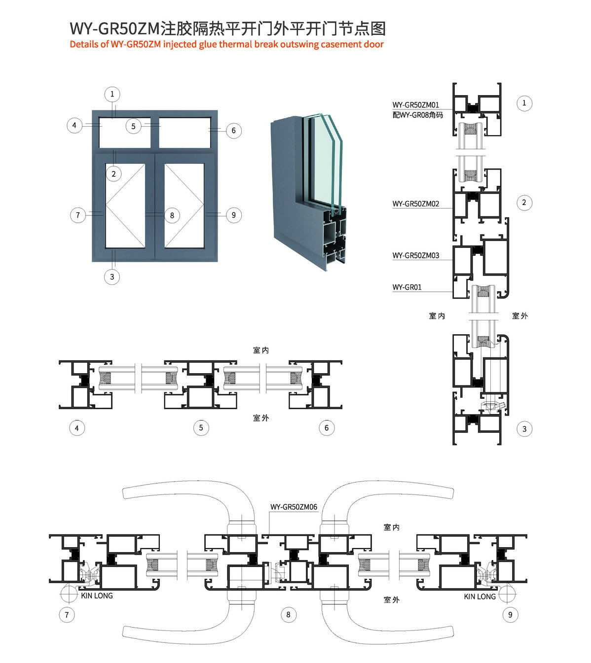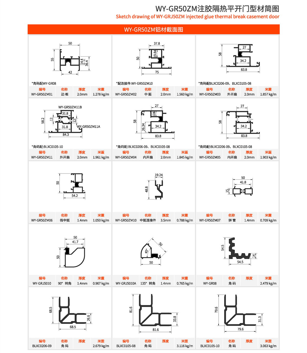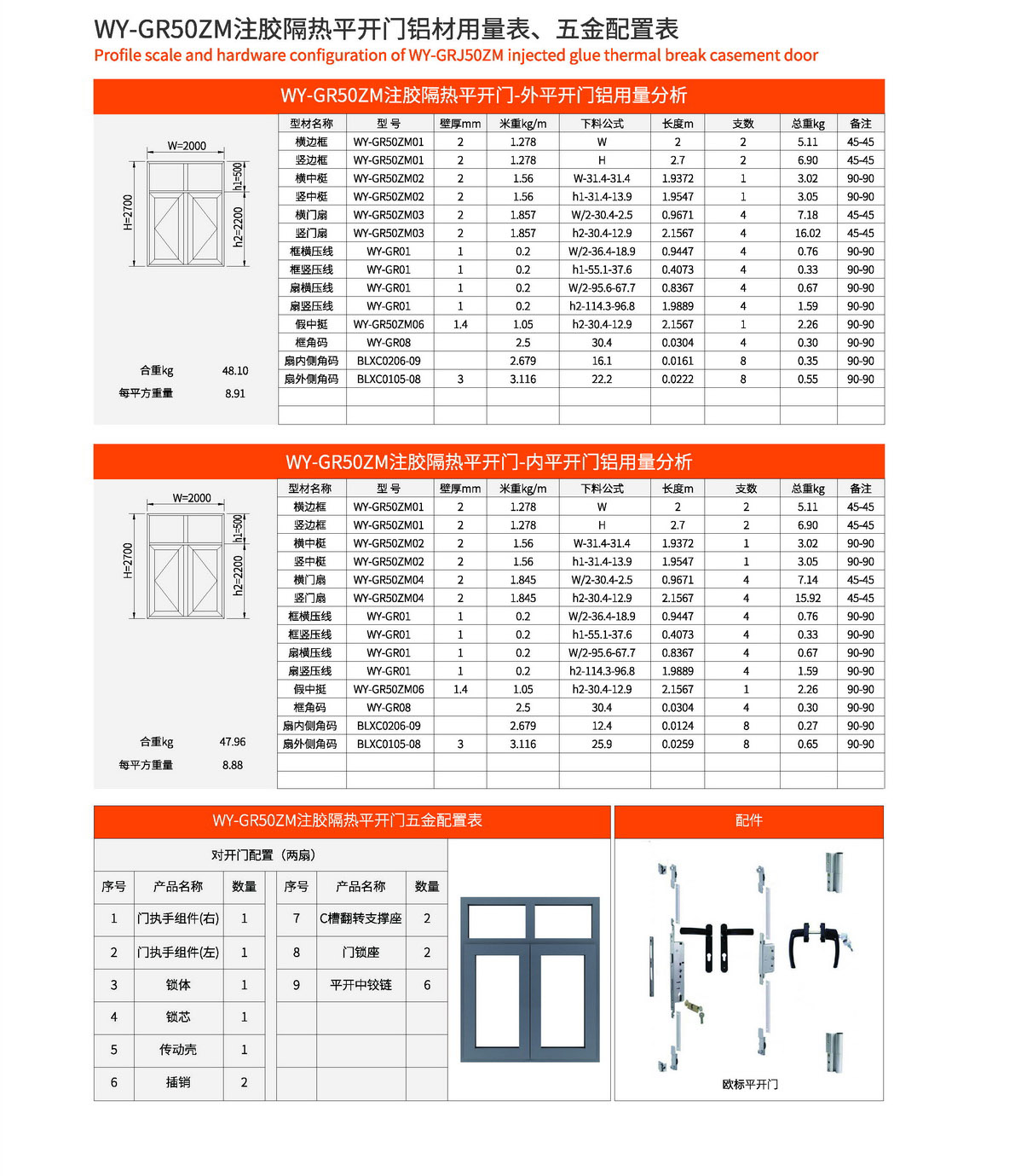 1、外框宽50mm,边框壁厚2.0mm,门扇壁厚2.0mm。 2、型材采用注胶隔热工艺,强度好。 3、五金槽口均采用欧标槽口设计,可自由搭配标准配件。 4、框扇采用45°切锯角码撞角连接,牢固可靠。 5、可做内开、外开等多种门型。 6、玻璃槽口可根据需要自由搭配压线。 7、2.7mx2.0m标准窗型每平方耗材8.9kg。