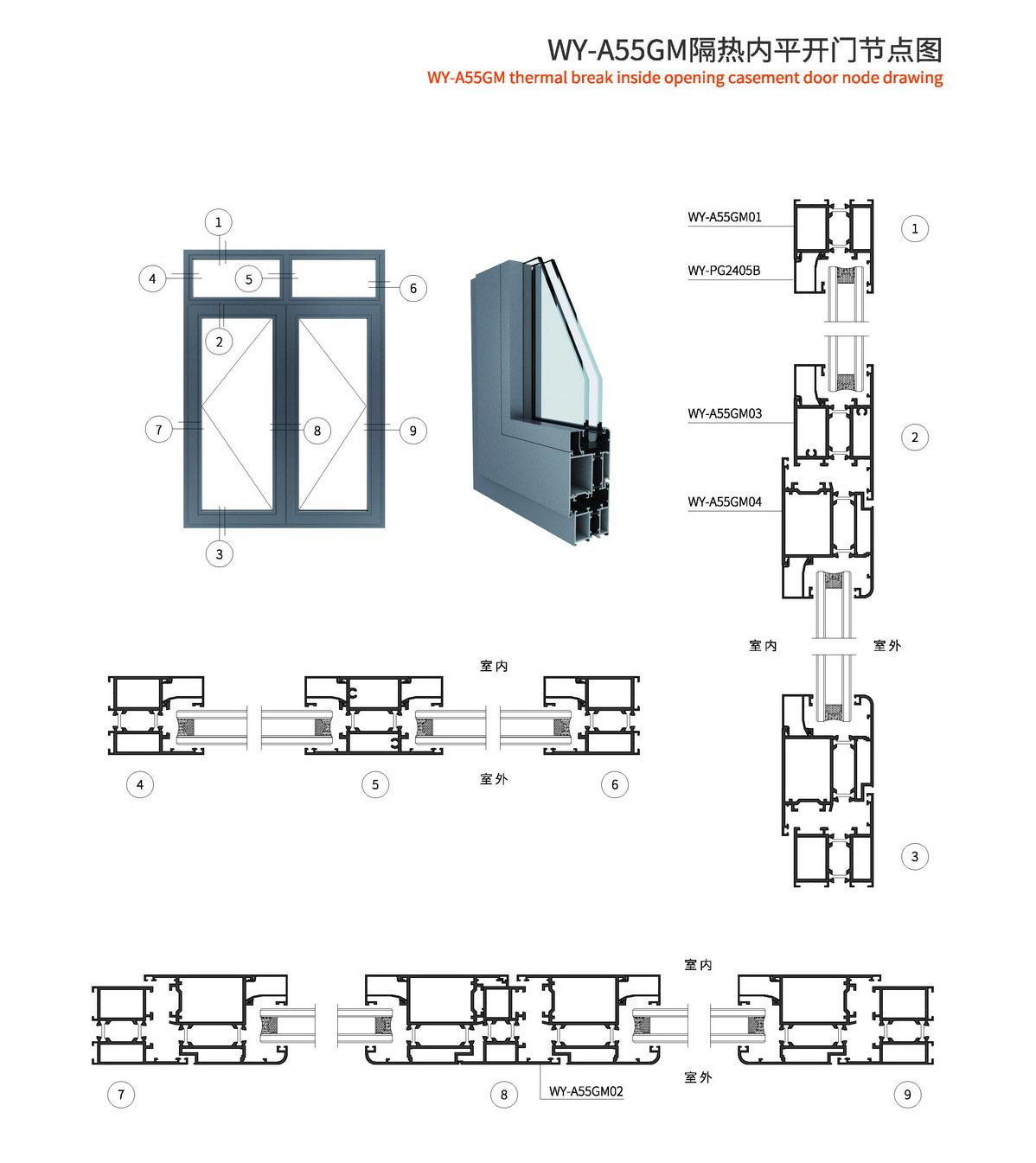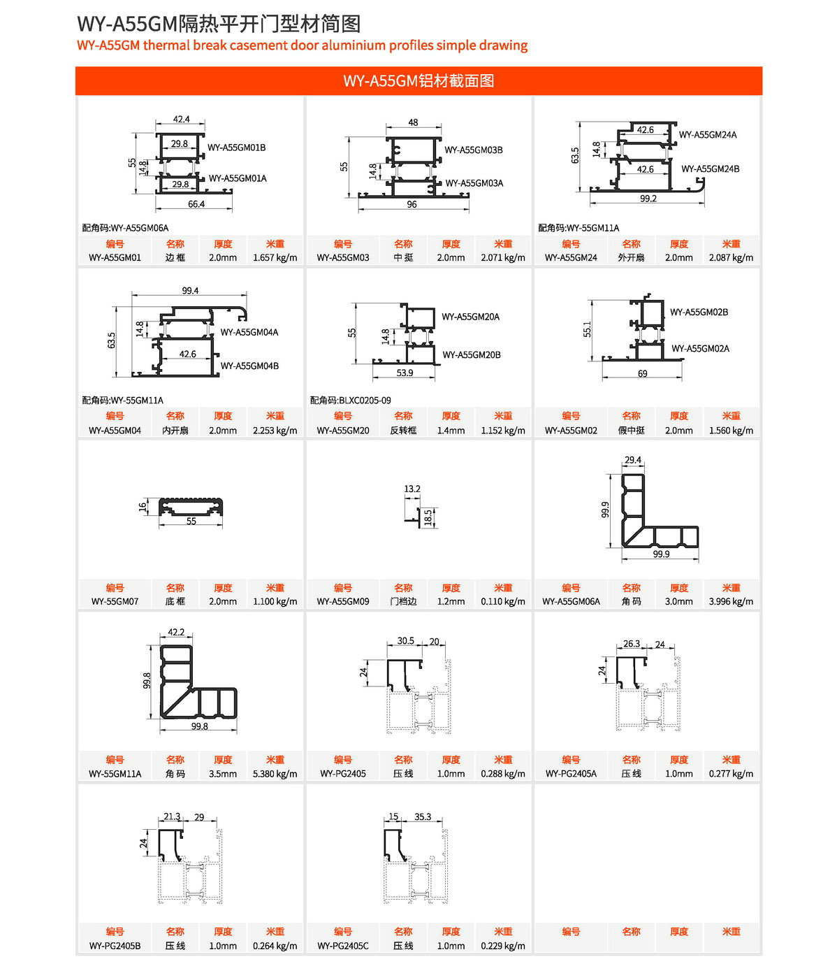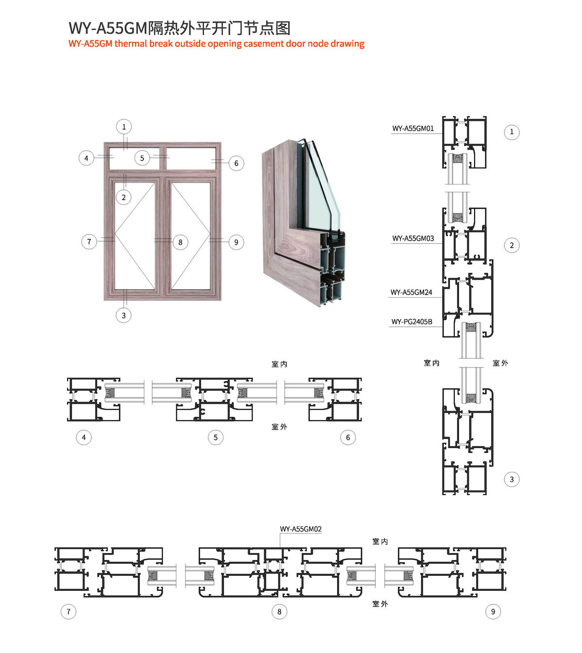 1、外框宽100mm,边框壁厚1.6mm,窗扇壁厚1.6mm。 2、玻璃扇外开,金钢纱扇内开。 3、五金槽口均采用欧标槽口设计,可自由搭配标准配件。 4、断桥三腔节能设计,满足节能减排要求,型材室内部分采用刨花立体凹凸木纹,极强实木质感;室外表面处理多色可选。 5、框扇采用活动角码45度连接。 6、玻璃槽口25、32、38mm,可自由选配。 7、窗扇可装弯形执手,硬度高,开启方便。 8、1.5mx1.5m标准窗型每平方耗材13.9kg.