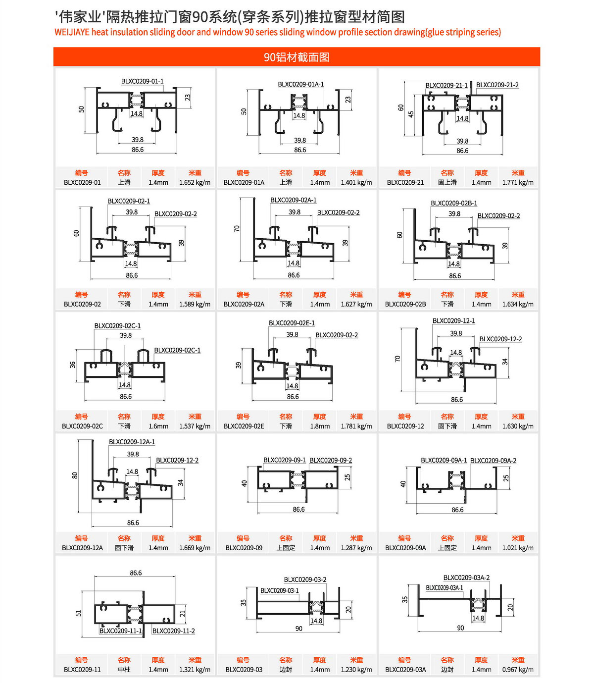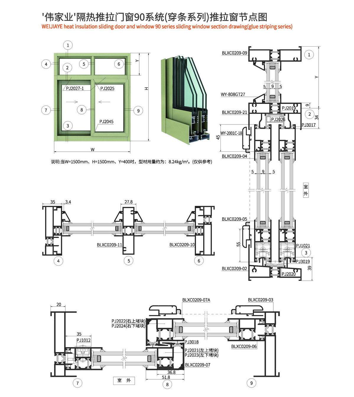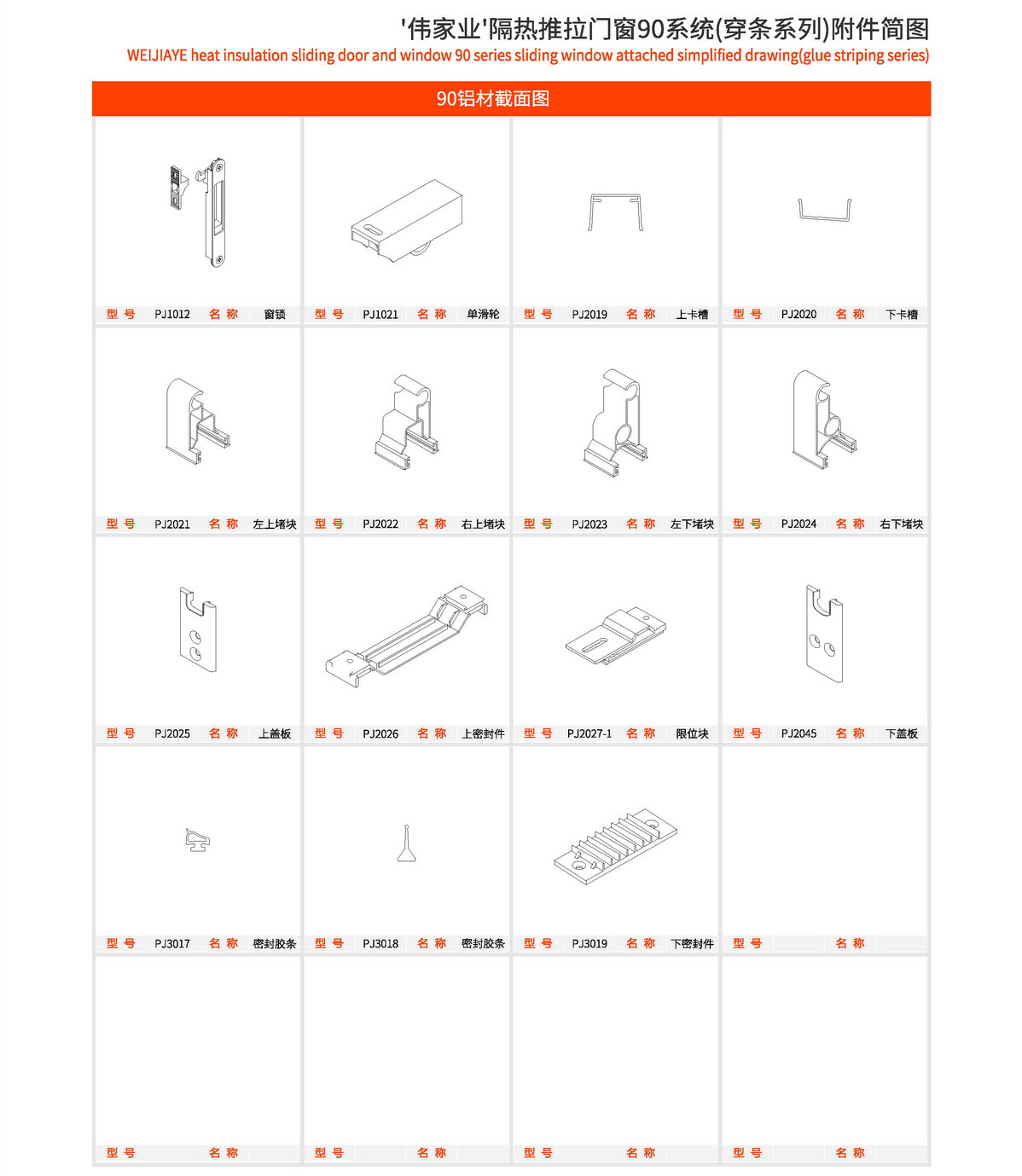 1、本系统现有80注胶推拉窗、90注胶推拉窗、90穿条推拉窗和90穿条推拉门品种并配备了转角和拼接型材,为制做条形窗和带形窗提供了方便。