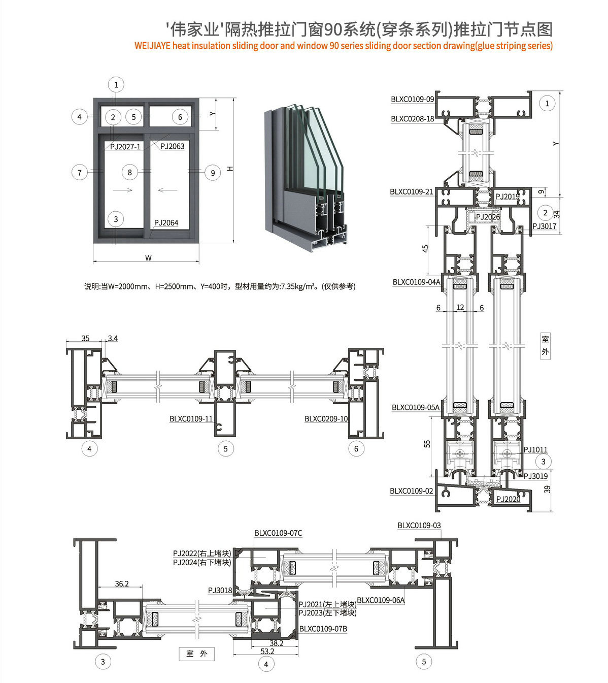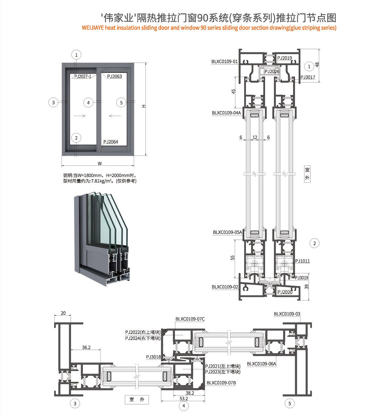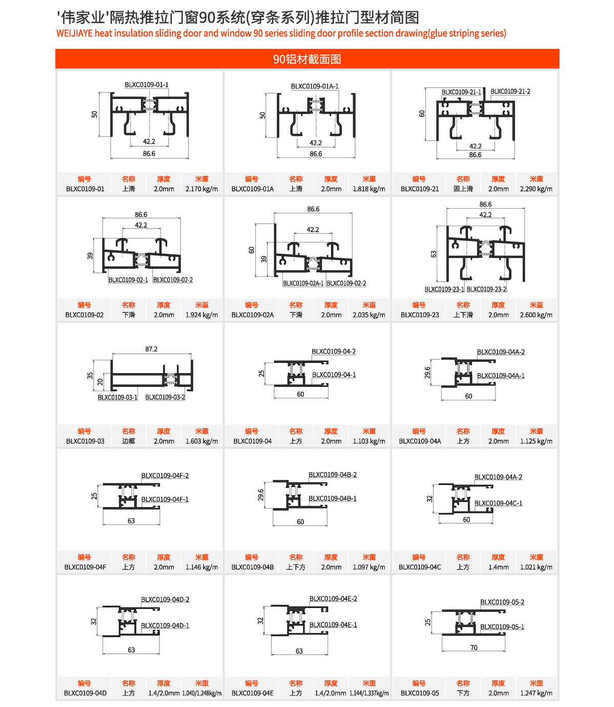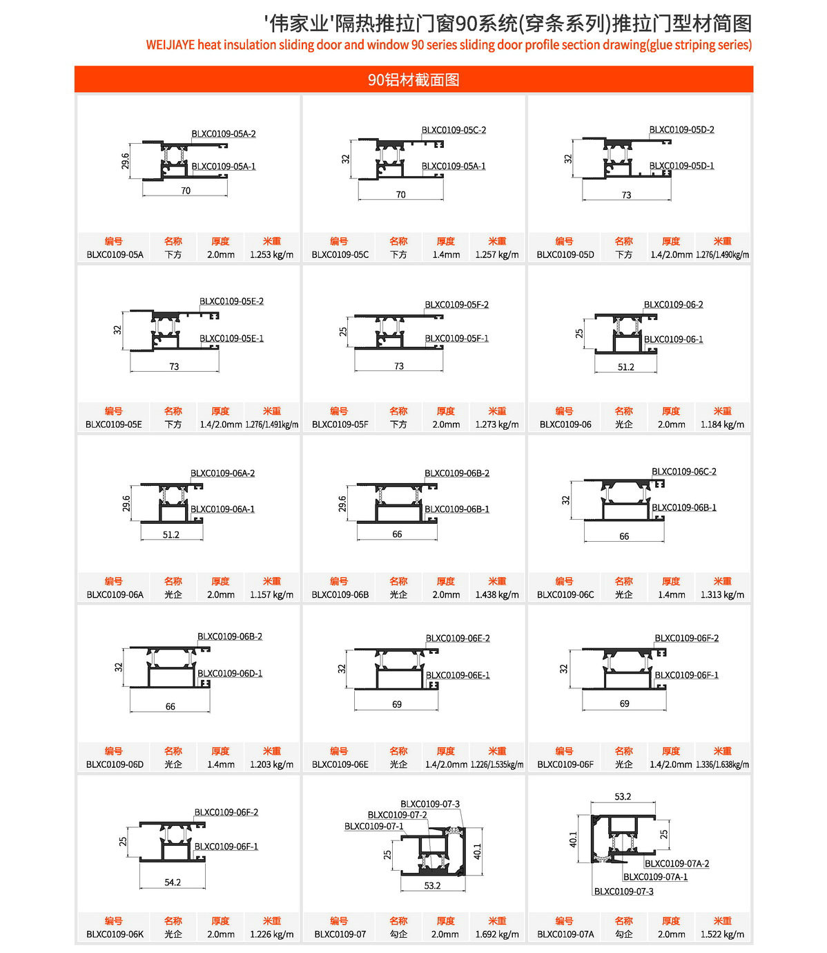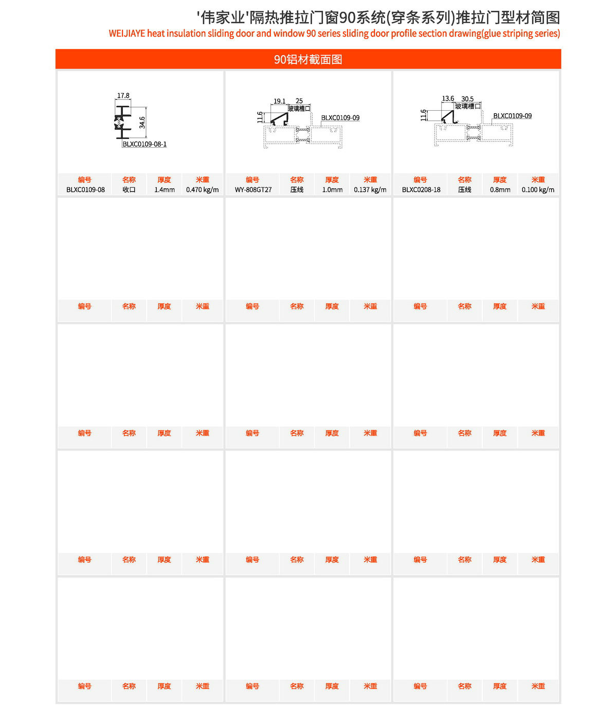 1、本系统现有80注胶推拉窗、90注胶推拉窗、90穿条推拉窗和90穿条推拉门品种并配备了转角和拼接型材,为制做条形窗和带形窗提供了方便。