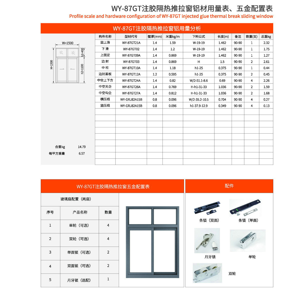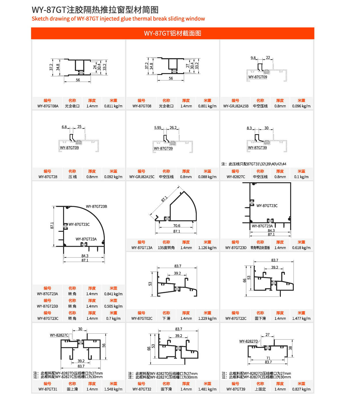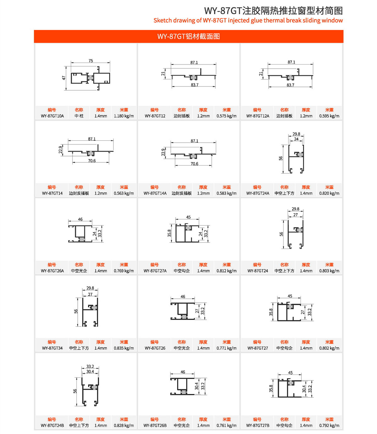 主型材:边封宽87mm,型材壁厚1.4mm;采用美式注胶断桥铝型材,强度高,降低传导系数,保温隔热性能优越,抗拉、抗剪强度高 连接方式:采用螺钉90度插接,加工工艺方便、简单、可靠 玻璃槽口:24mm、27mm 、30.4mm 开启方式:水平推拉 可做窗型:两扇窗、四扇窗、转角飘窗等 适用范围:民用建筑和工程 耗材:1.5mx1.5m标准窗型每平方耗材6.6kg