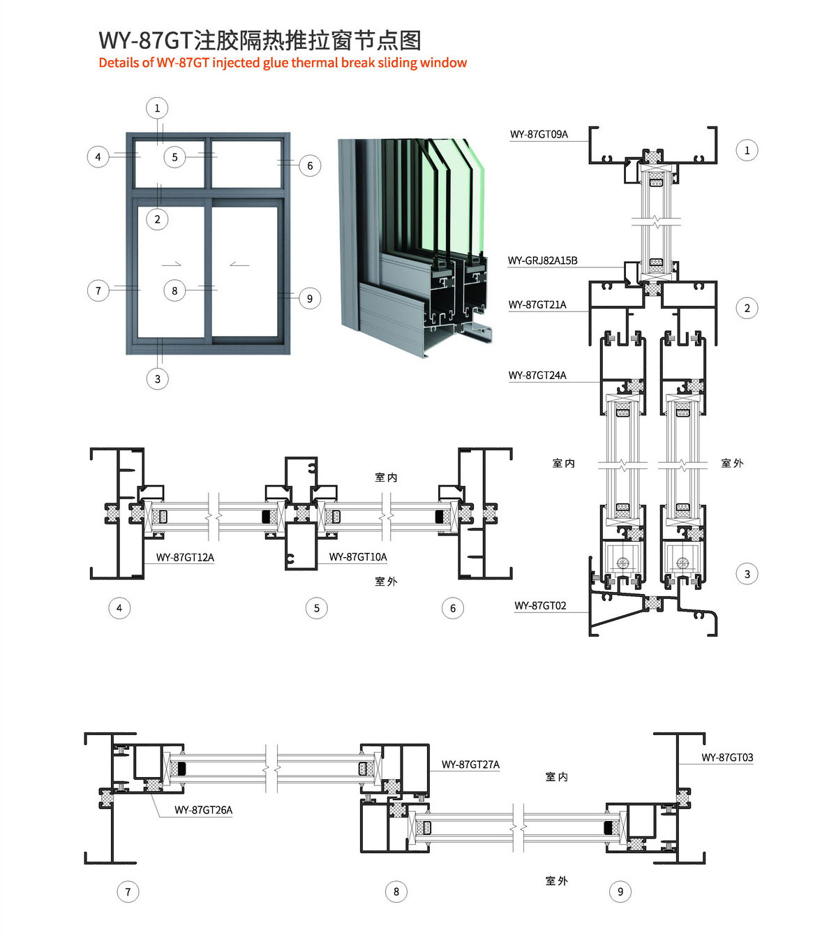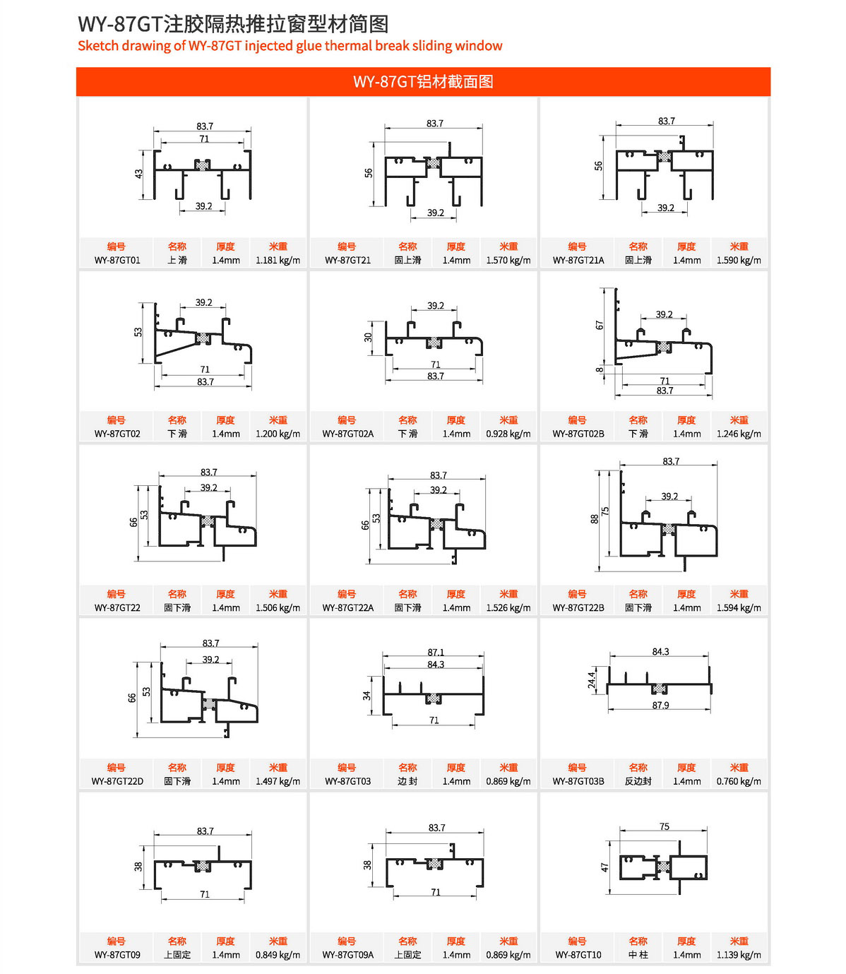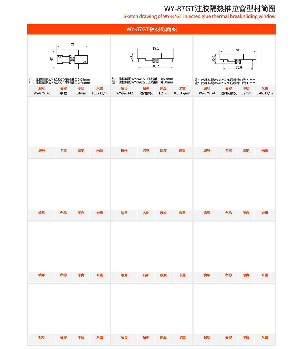 主型材:边封宽87mm,型材壁厚1.4mm;采用美式注胶断桥铝型材,强度高,降低传导系数,保温隔热性能优越,抗拉、抗剪强度高 连接方式:采用螺钉90度插接,加工工艺方便、简单、可靠 玻璃槽口:24mm、27mm 、30.4mm 开启方式:水平推拉 可做窗型:两扇窗、四扇窗、转角飘窗等 适用范围:民用建筑和工程 耗材:1.5mx1.5m标准窗型每平方耗材6.6kg