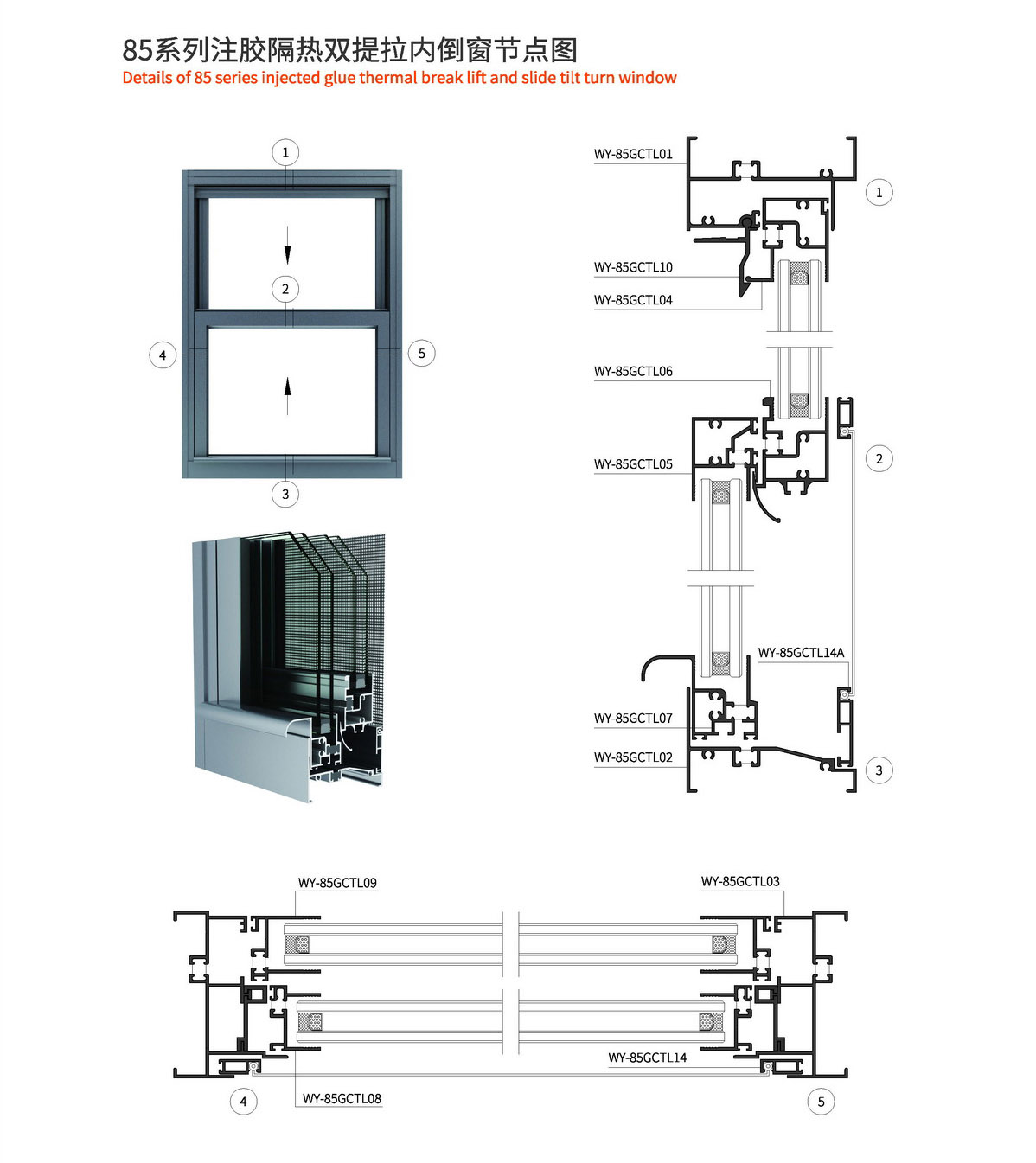 1.本系列边框宽度为85mm,称为85系列双提拉内倒窗; 2.采用美式注胶隔热型材,强度高; 3.本窗型立面精巧、开启、通风方式合理; 4.本窗型气密、水密性优越; 5.本窗型结构安全、不占用空间; 6.卷片式或螺杆式提拉,可上下提拉和内倾一定角度,操作灵活,便于通风和清洁玻璃; 7.本窗型节约制造材料。