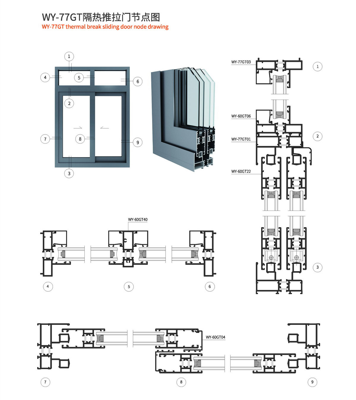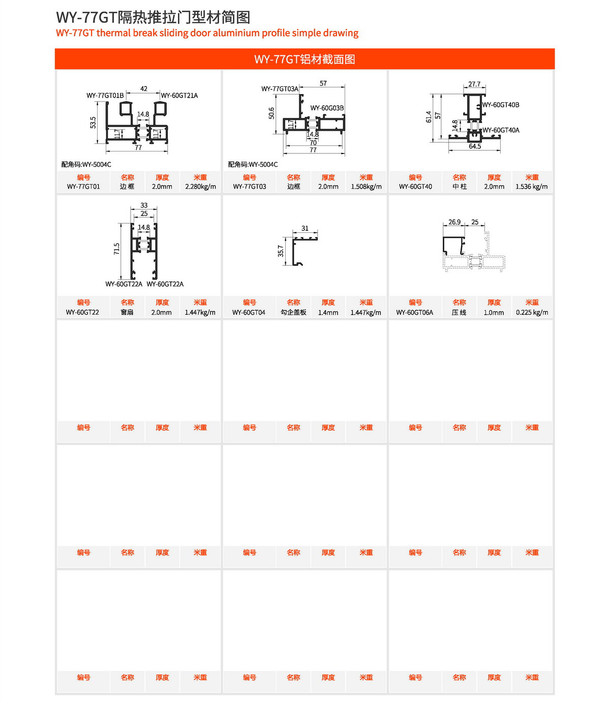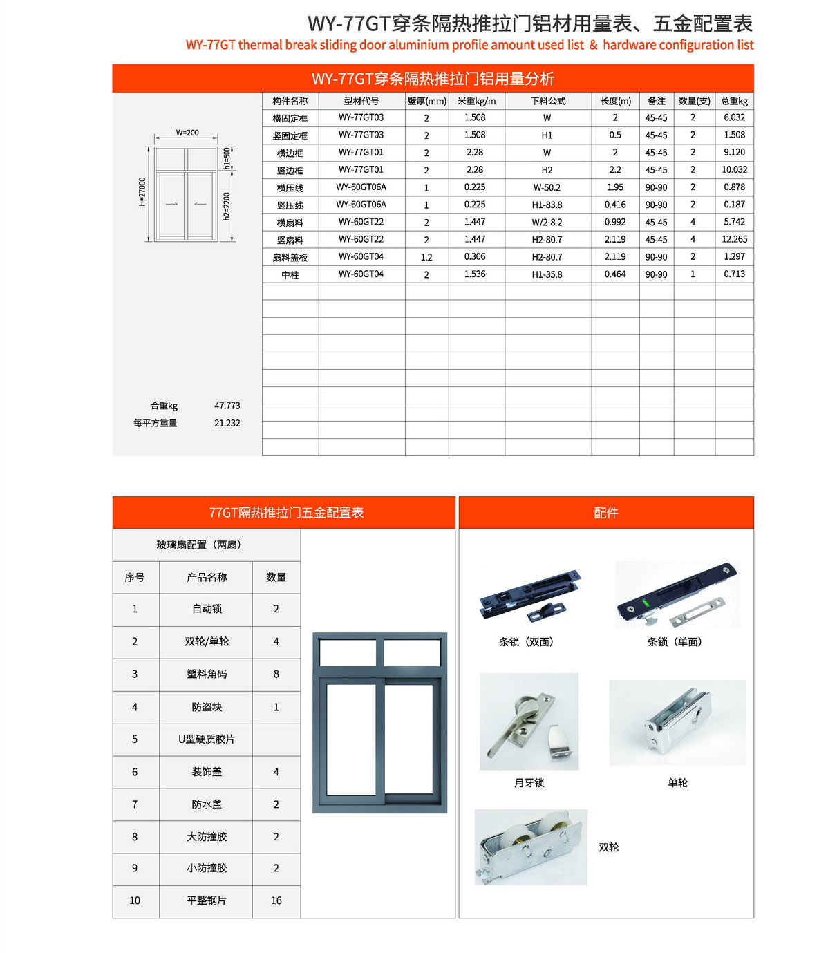 主型材:边框宽77mm,型材壁厚1.4mm;采用14.8mm隔热条,强度高,降低传导系数,保温隔热性能优越,抗拉、抗剪强度高。 连接方式:边框、窗扇切45°活动角码连接,加工工艺方便、简单、可靠。 玻璃槽口:25mm、29.2mm 开启方式:水平推拉 可做窗型:两扇门、四扇门、门联窗等 适用范围:民用建筑和工程 耗材: