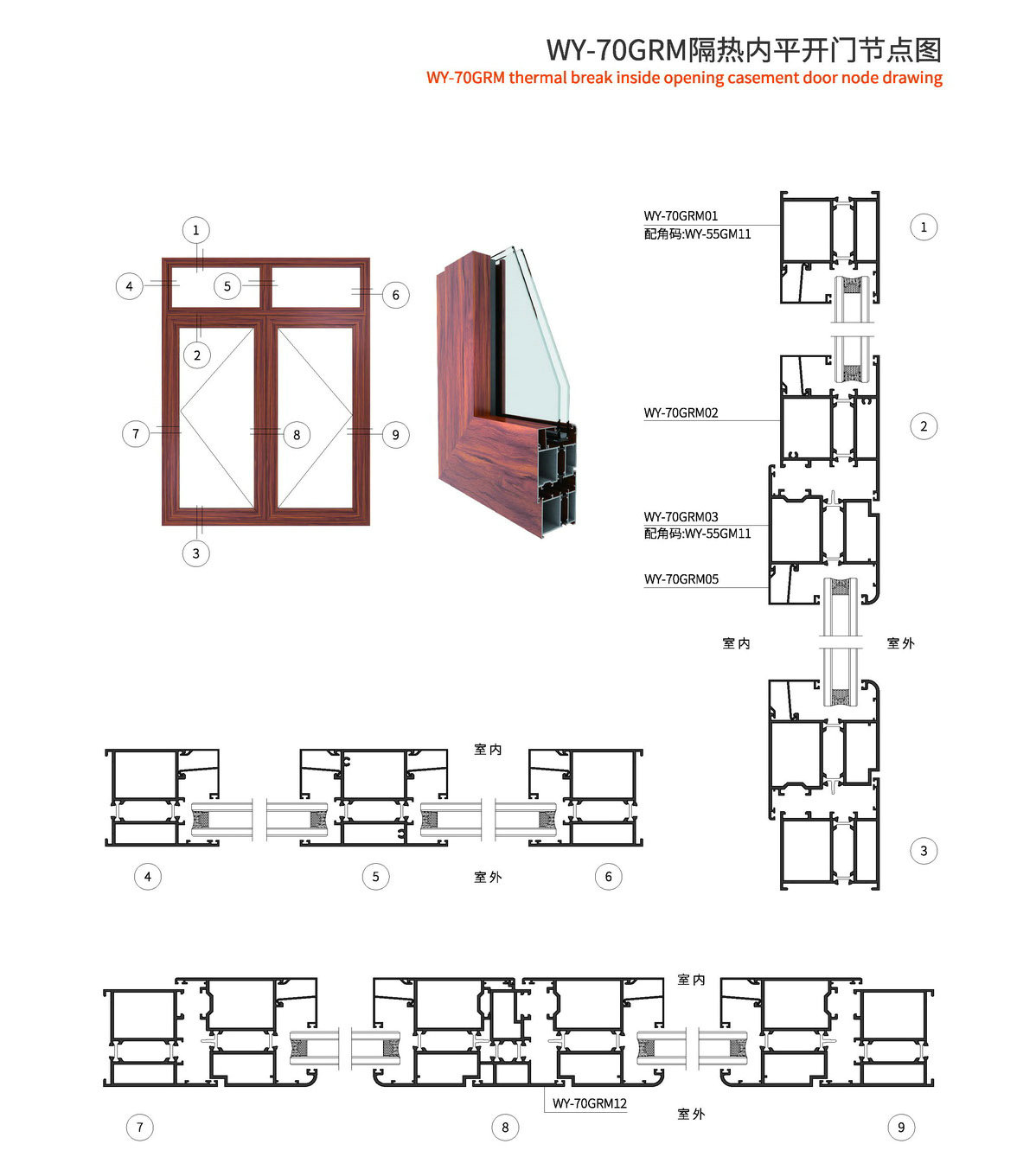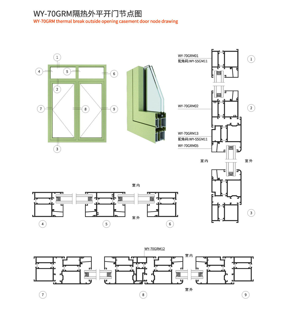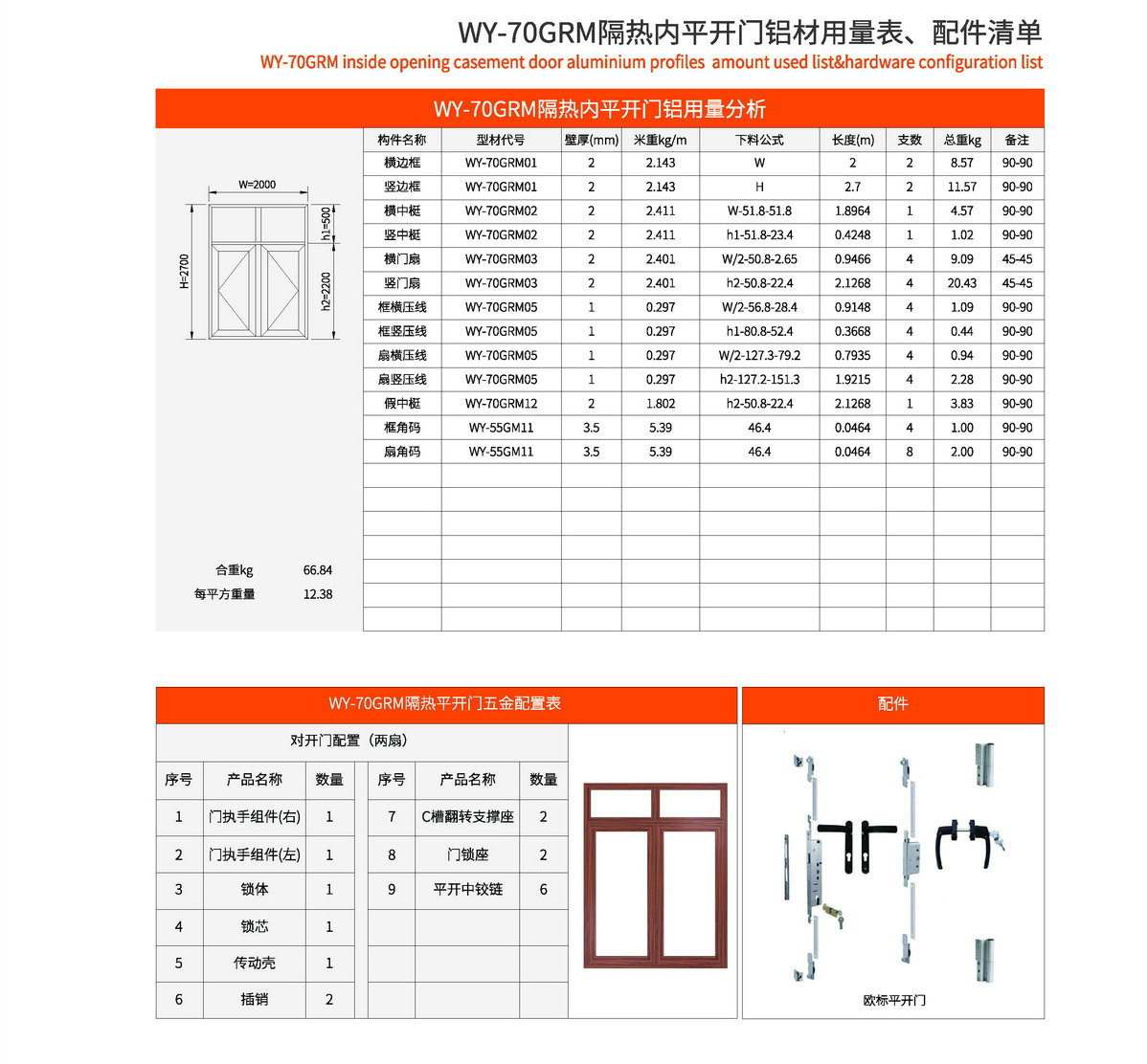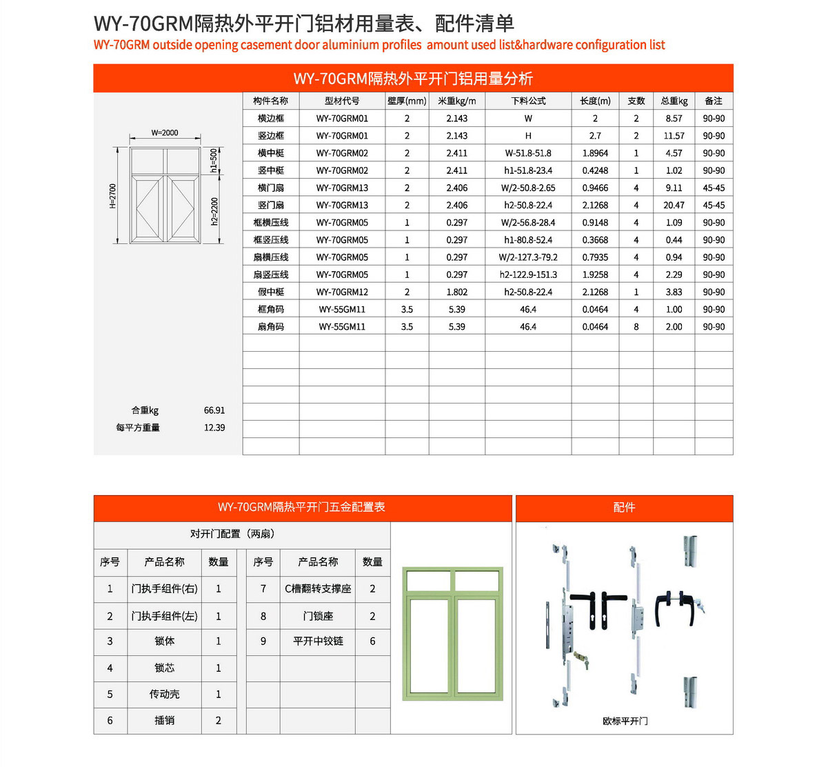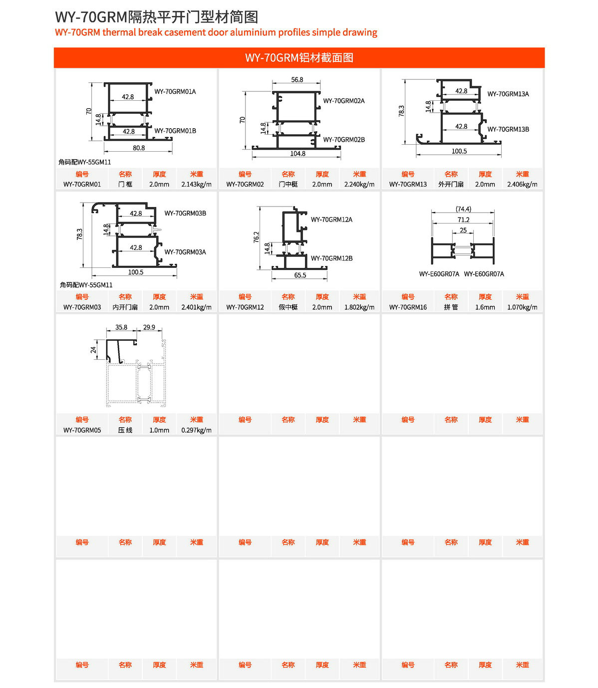 1、型材外框宽70mm,壁厚2.0mm。称为70隔热平开门;