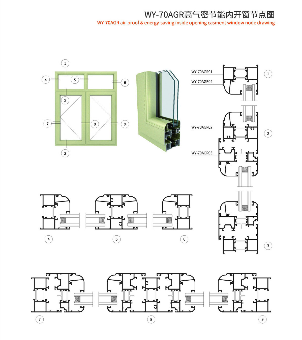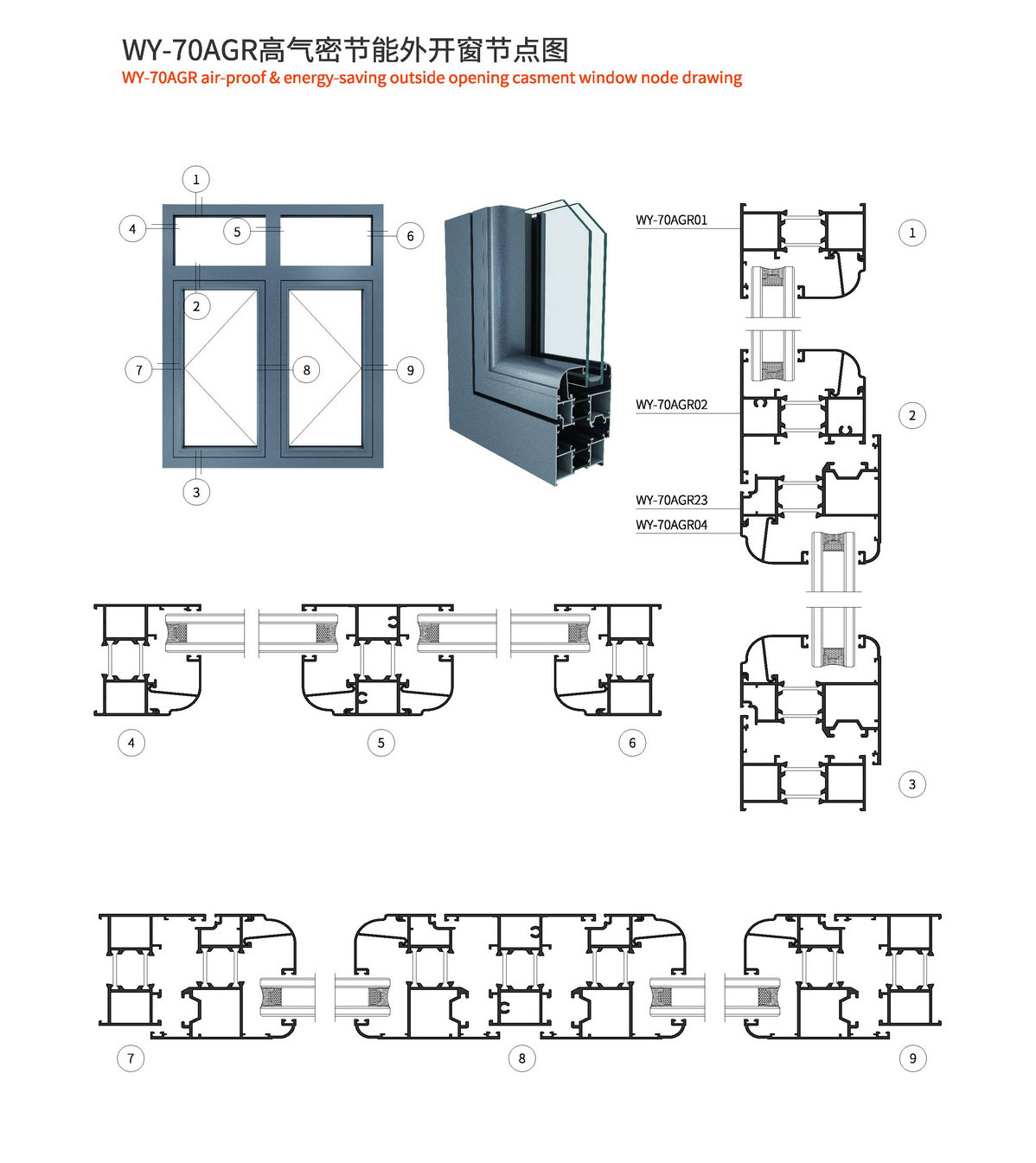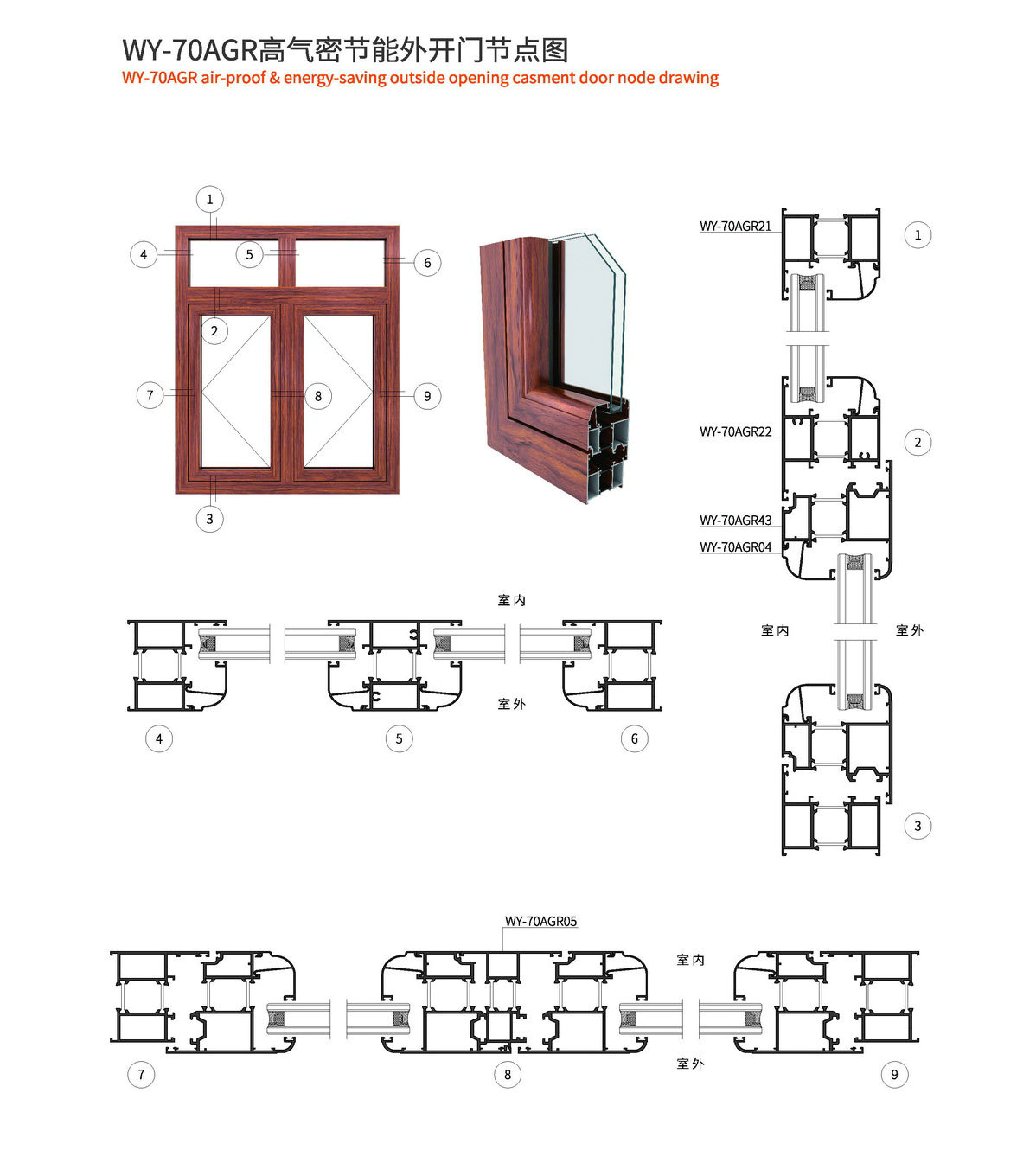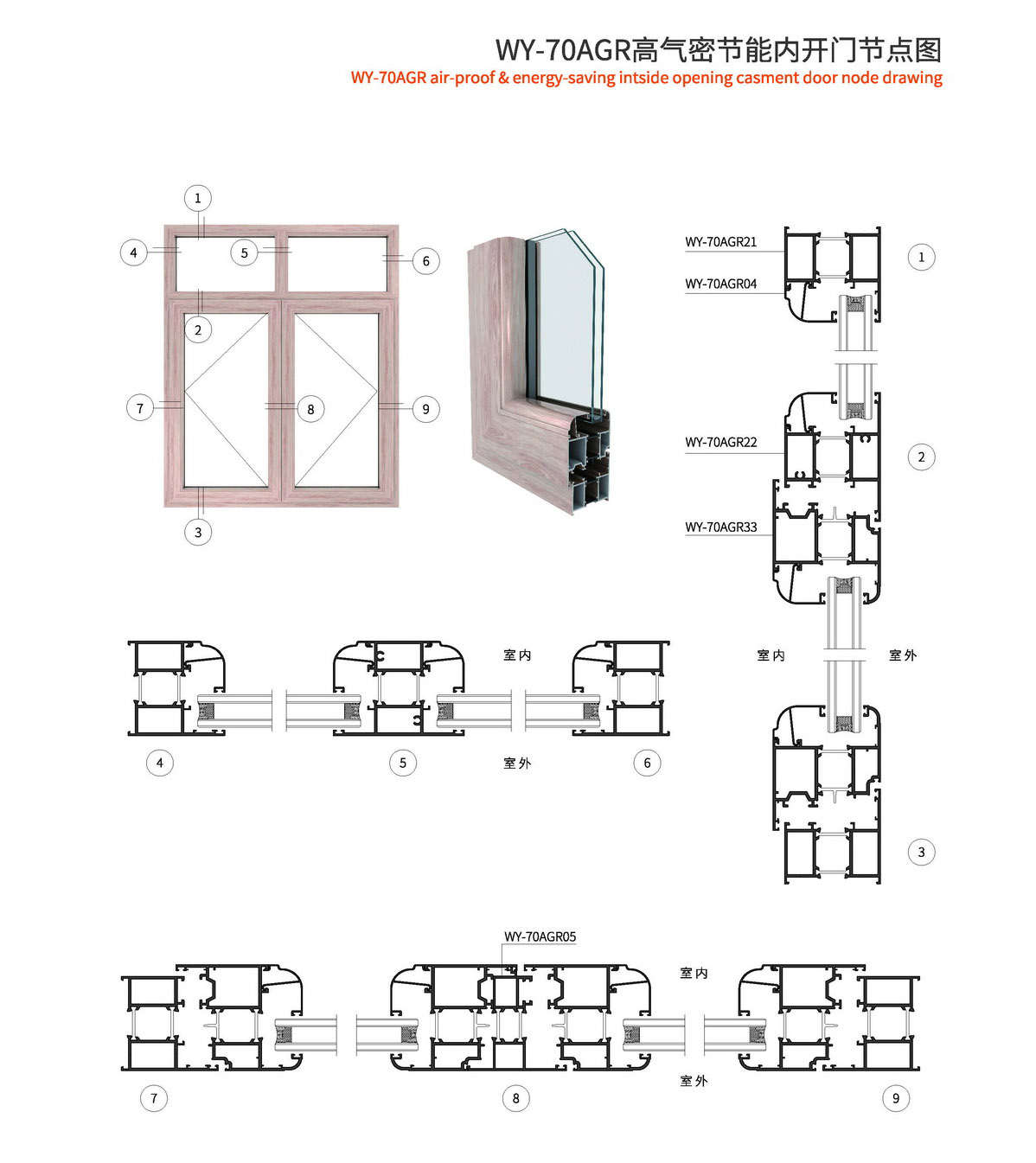 1、型材外框宽70mm,型材壁厚1.4mm; 2、采用优质尼龙玻璃纤维(PA66)25mm隔热胶条,传热系数低,保温隔热、隔音性能更优异; 3、此系列可做外开、外开上悬、内平开、内开内倒等; 4、本系列五金槽口采用标准槽口,五金件通配; 5、本系列内开采用等压原理设计,使整窗气密性、水密性更佳; 6、本系列有多种槽口的压线,客户可根据玻璃厚度自行选择压线款式; 7、本系列室内室外可以做两种颜色,外观更美观。