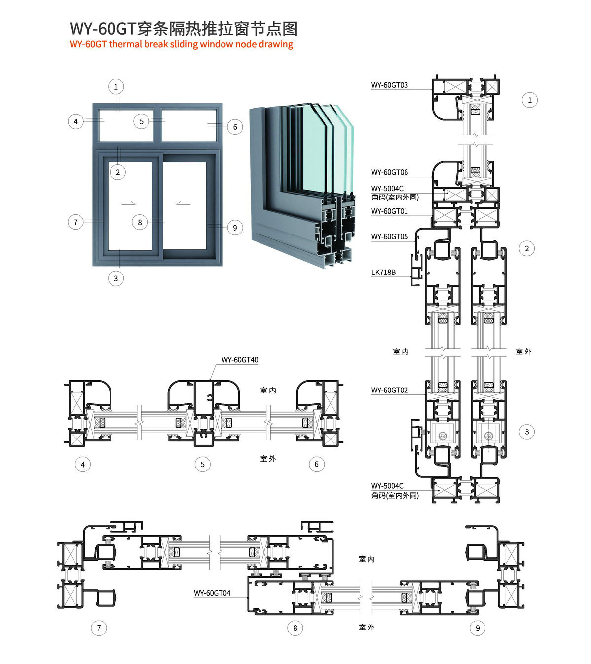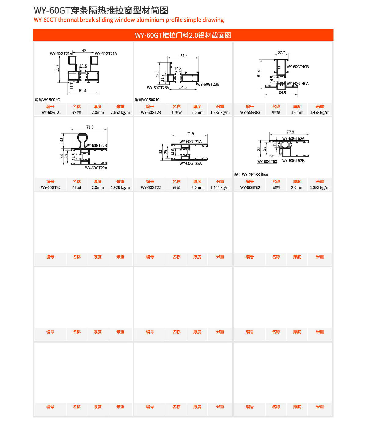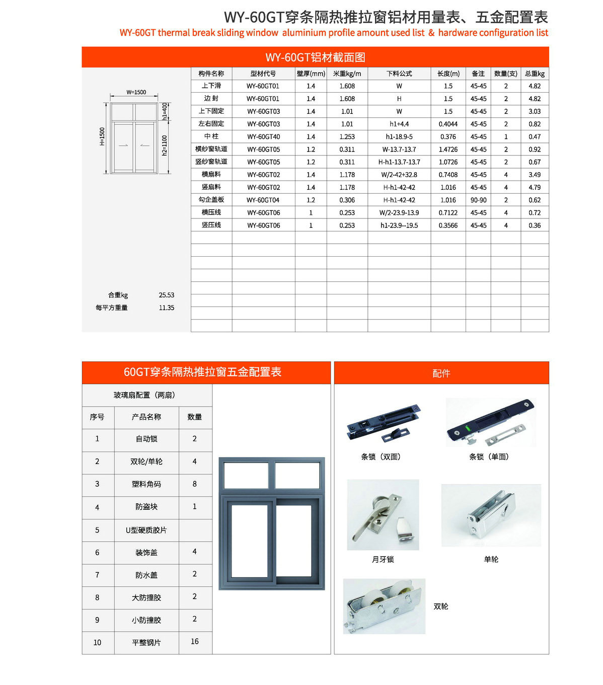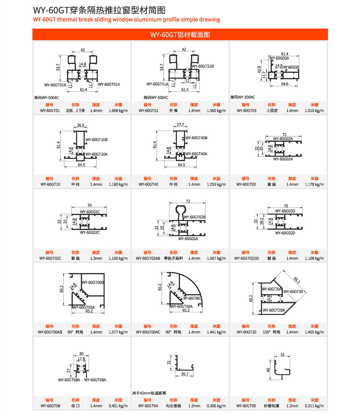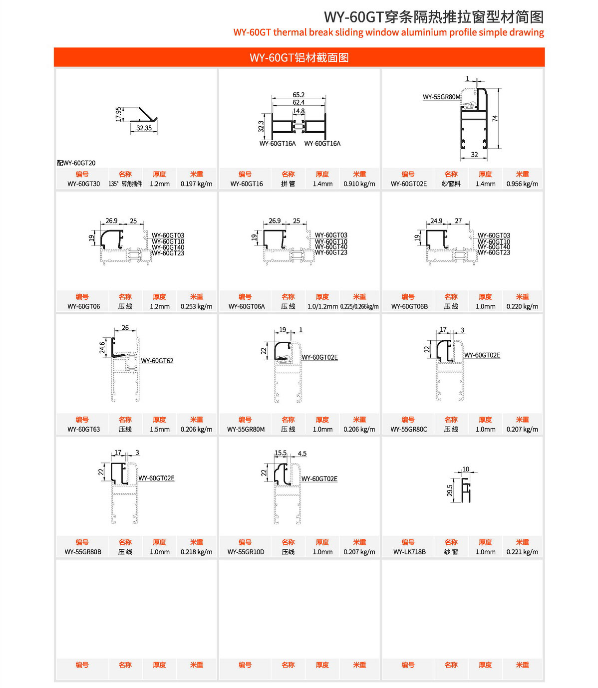 主型材:边框宽61.4mm,型材壁厚1.4mm;采用14.8mm隔热条,强度高,降低传导系数,保温隔热性能优越,抗拉、抗剪强度高。 连接方式:边框、窗扇切45°活动角码连接,加工工艺方便、简单、可靠。 玻璃槽口:25mm、29.2mm 开启方式:水平推拉 可做窗型:两扇窗、四扇窗、转角飘窗、门联窗等 适用范围:民用建筑和工程 耗材:1.5mx1.5m标准窗型每平方耗材11.35kg