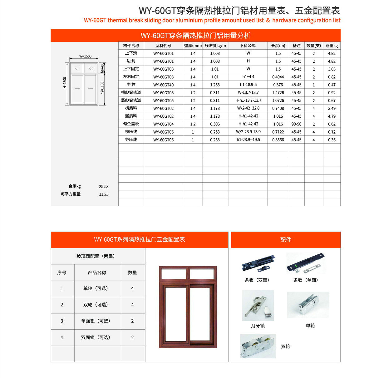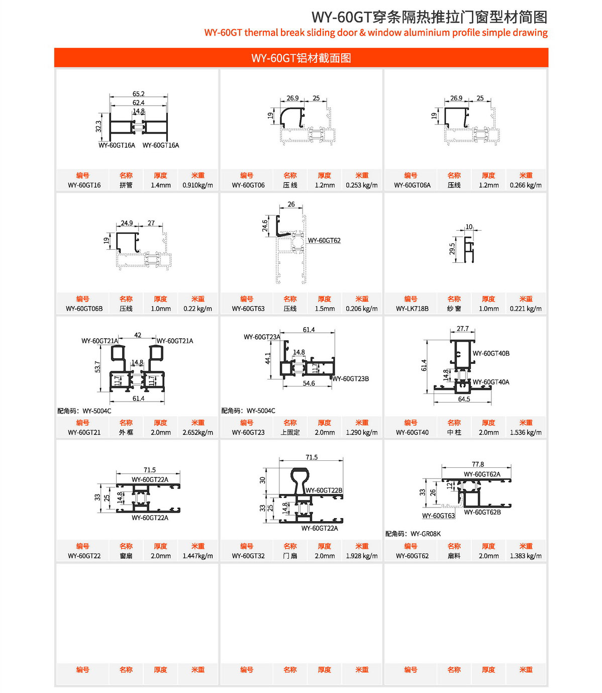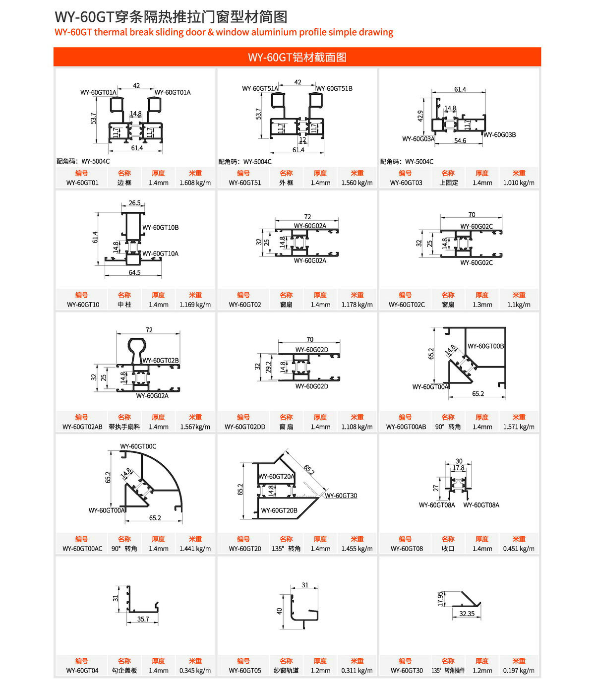 主型材:边框宽61.4mm,型材壁厚1.4mm;采用14.8mm隔热条,强度高,降低传导系数,保温隔热性能优越,抗拉、抗剪强度高。 连接方式:边框、窗扇切45°活动角码连接,加工工艺方便、简单、可靠。 玻璃槽口:25mm、29.2mm 开启方式:水平推拉 可做窗型:两扇窗、四扇窗、转角飘窗、门联窗等 适用范围:民用建筑和工程 耗材:1.5mx1.5m标准窗型每平方耗材9.99kg